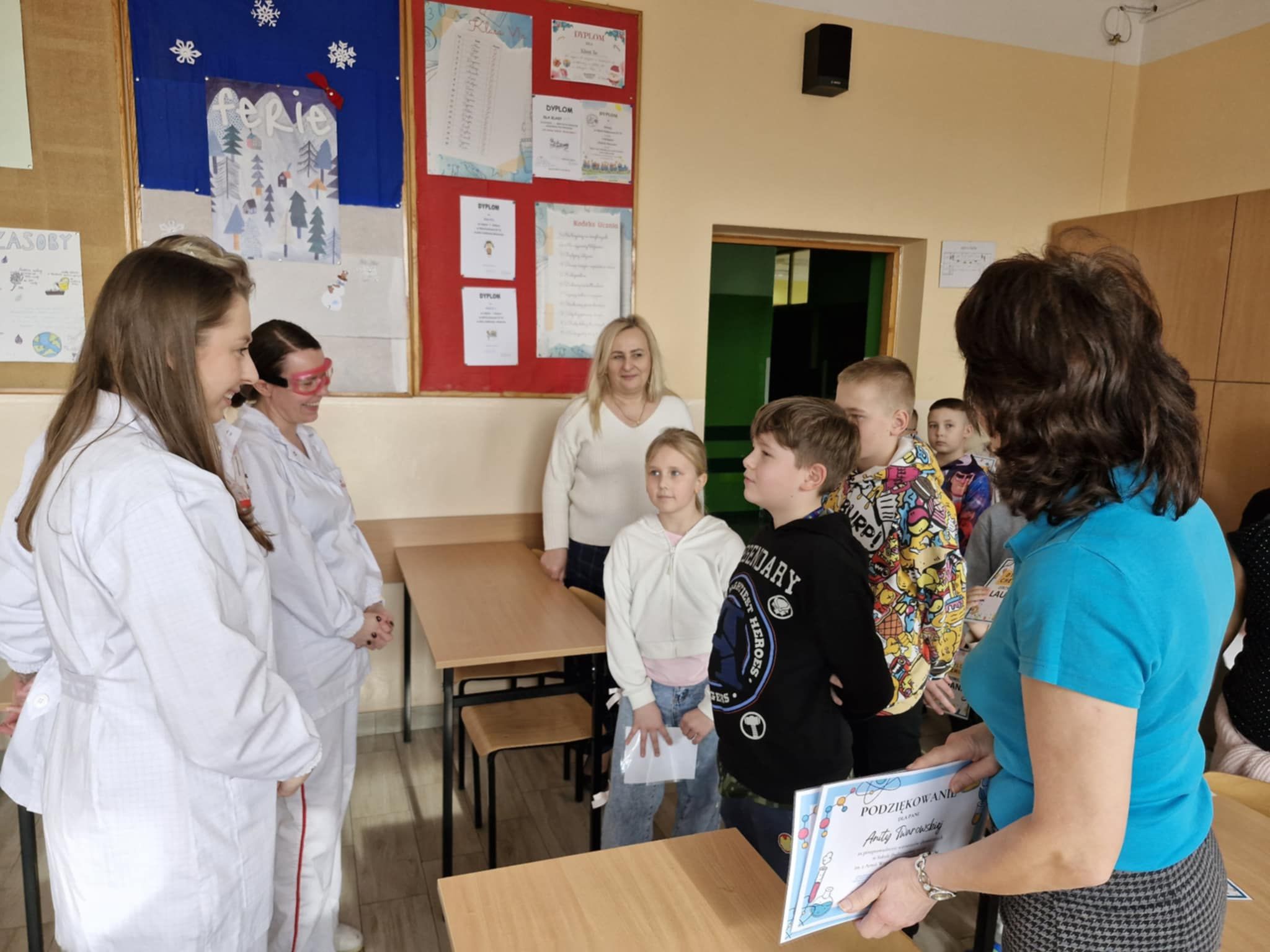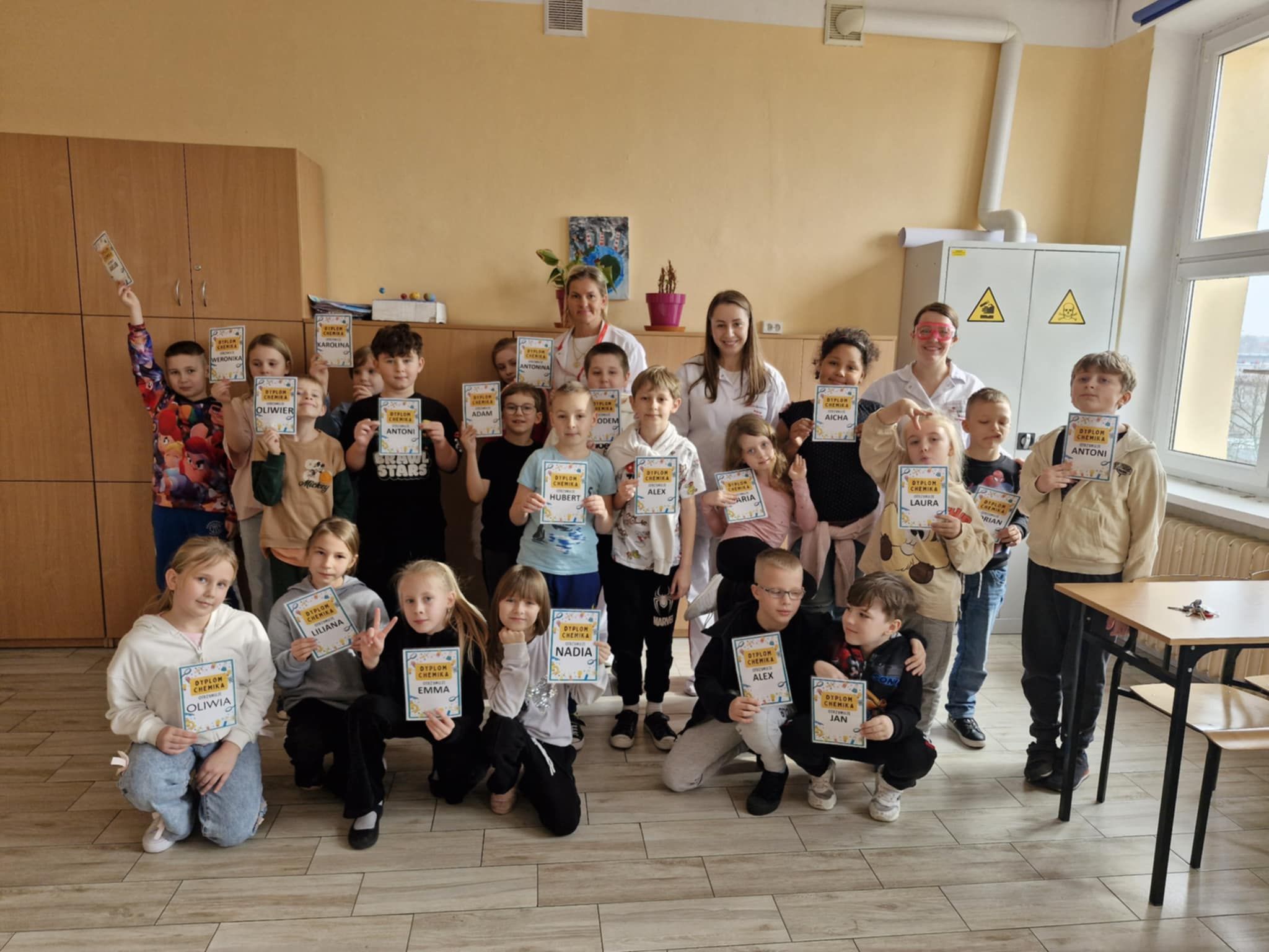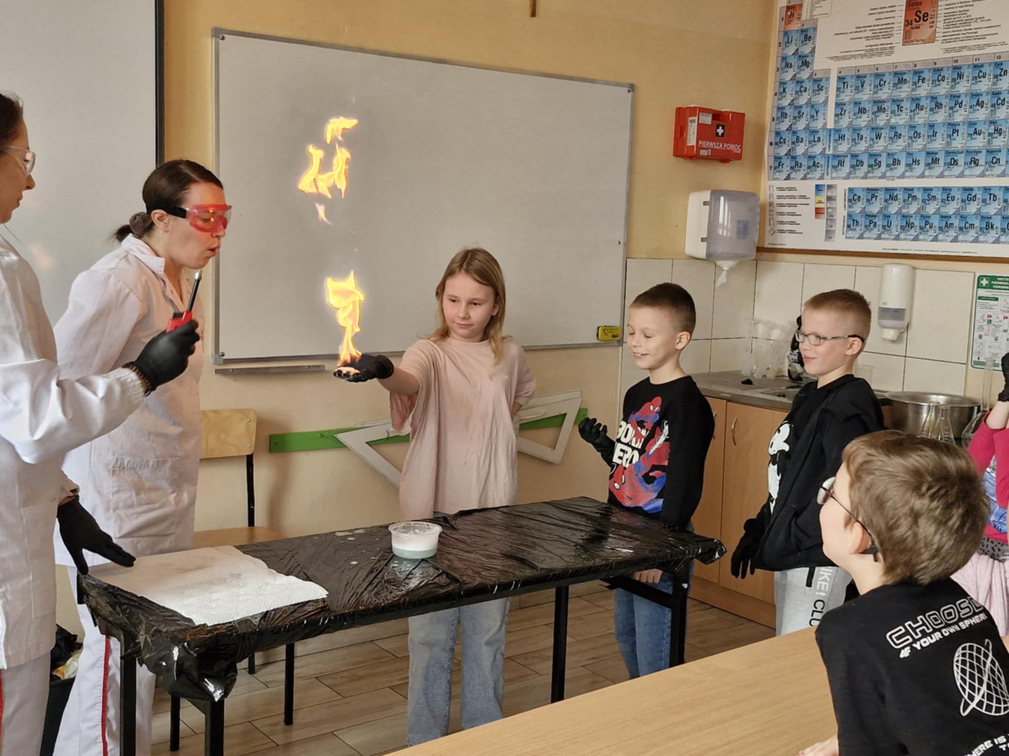 Klasa 2 b wzięła udział w warsztatach chemicznych. Panie, które na co dzień pracują w laboratorium przygotowały i przeprowadziły wspólnie z dziećmi ciekawe i widowiskowe doświadczenia i reakcje chemiczne. Była zmiana koloru cieczy, piana, płomienie i dym Dzieci były pod ogromnym wrażeniem