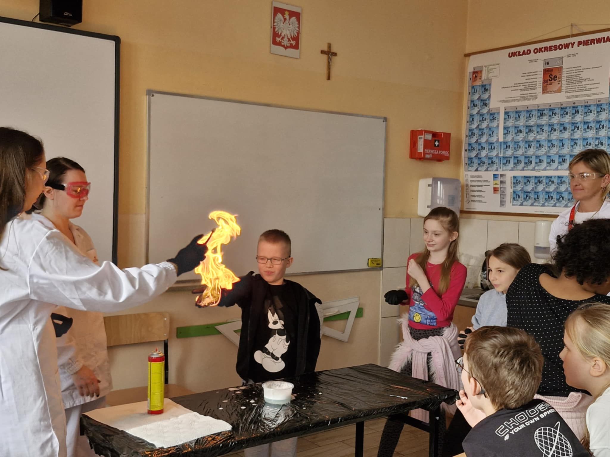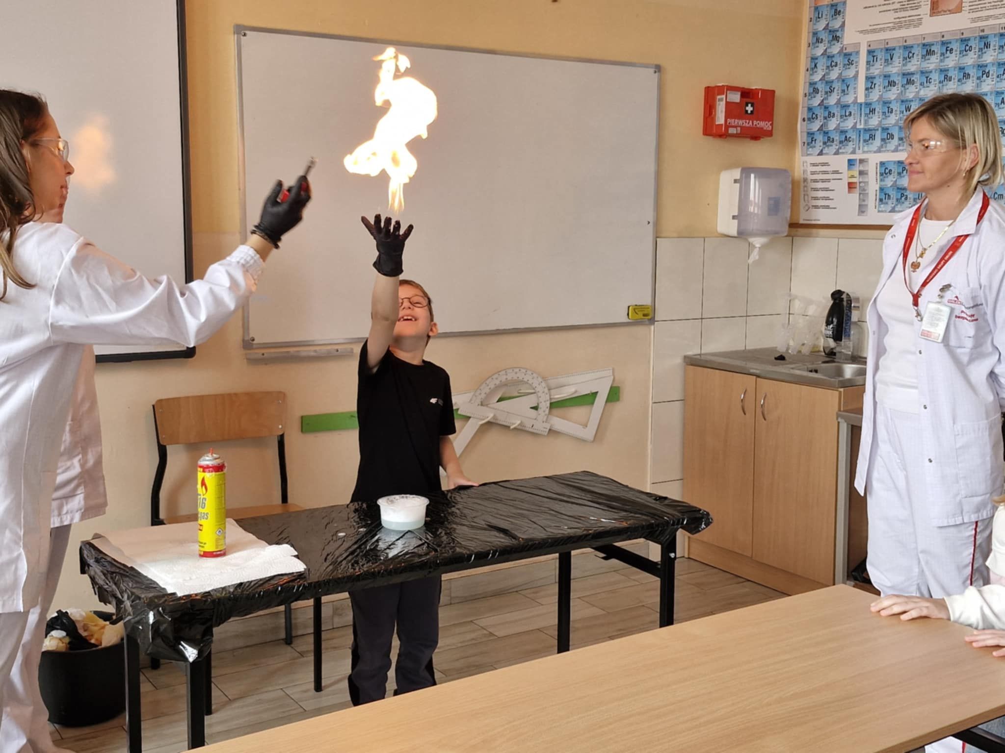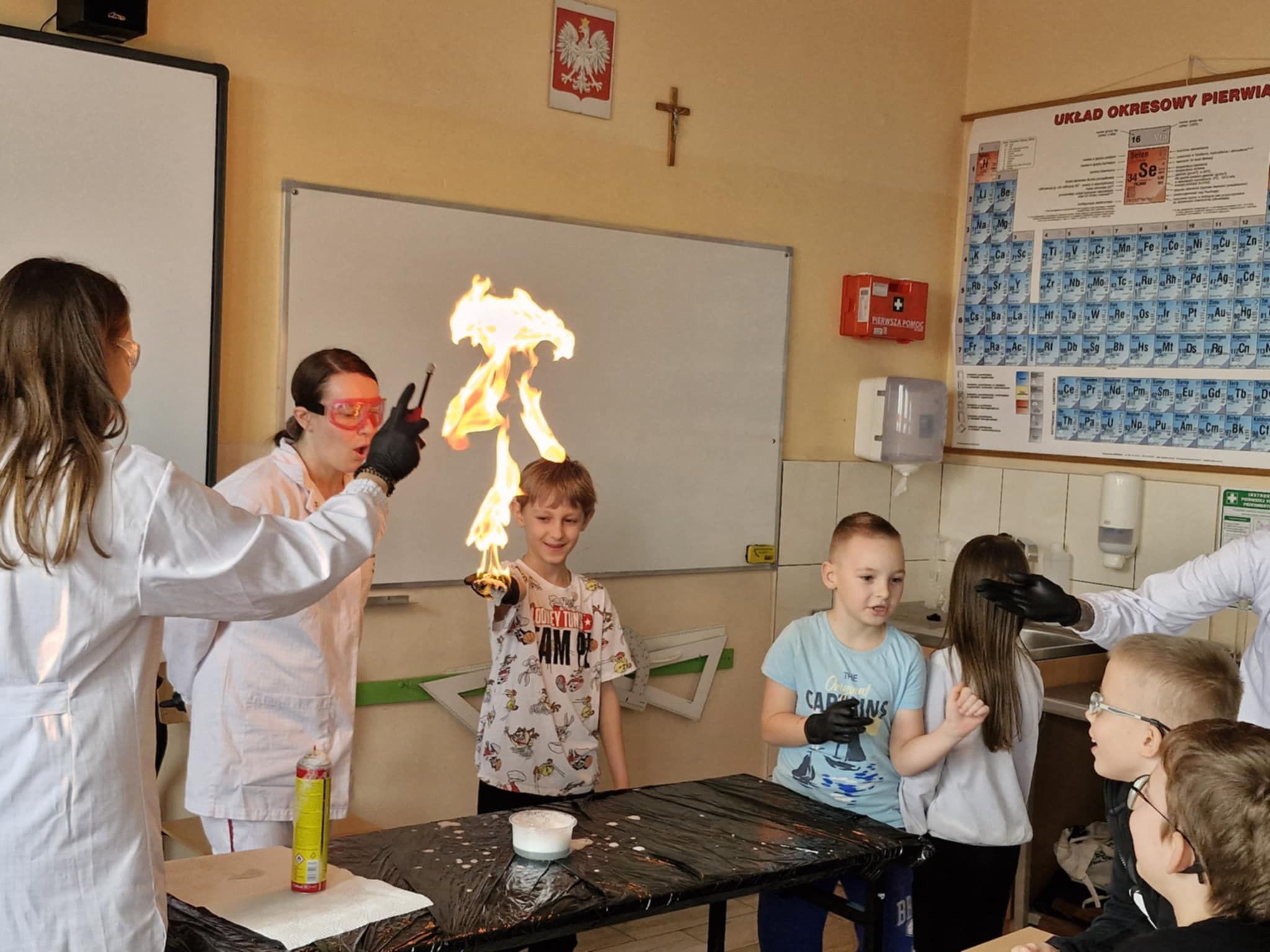 Klasa 2 b wzięła udział w warsztatach chemicznych. Panie, które na co dzień pracują w laboratorium przygotowały i przeprowadziły wspólnie z dziećmi ciekawe i widowiskowe doświadczenia i reakcje chemiczne. Była zmiana koloru cieczy, piana, płomienie i dym Dzieci były pod ogromnym wrażeniem