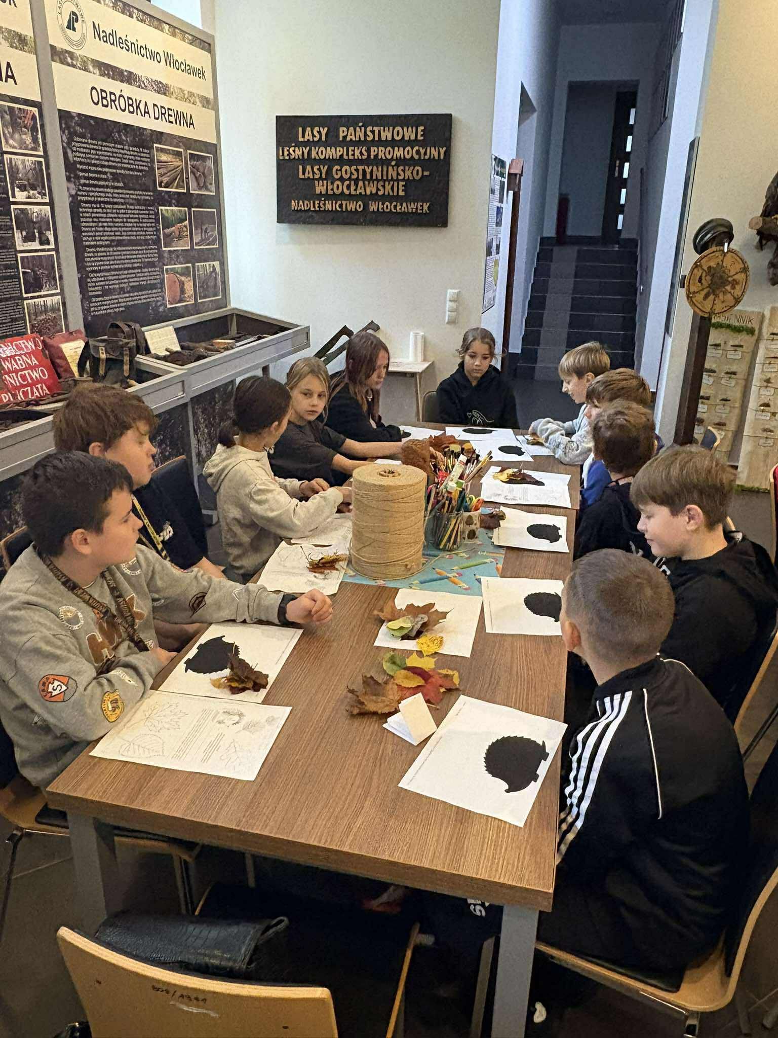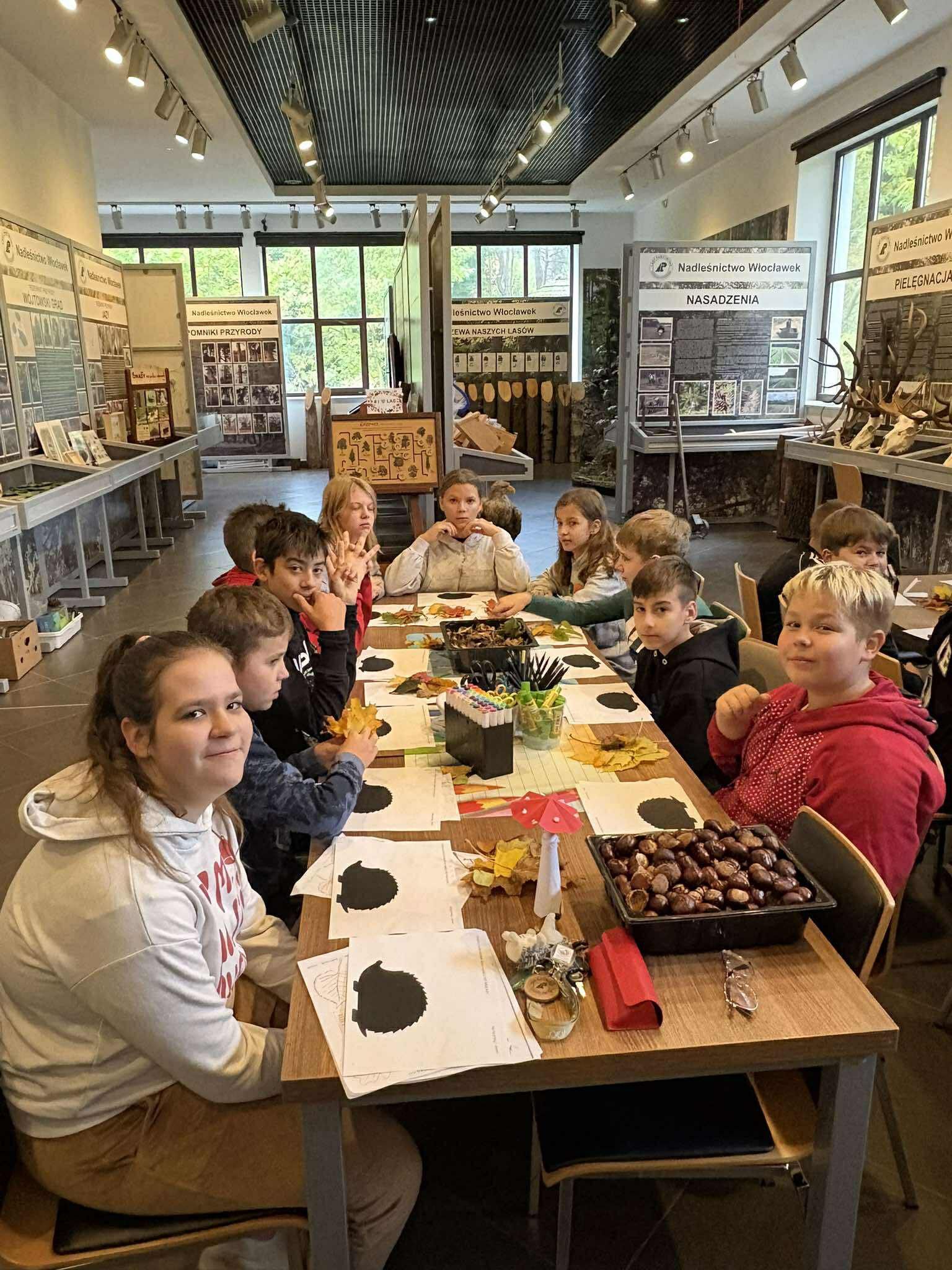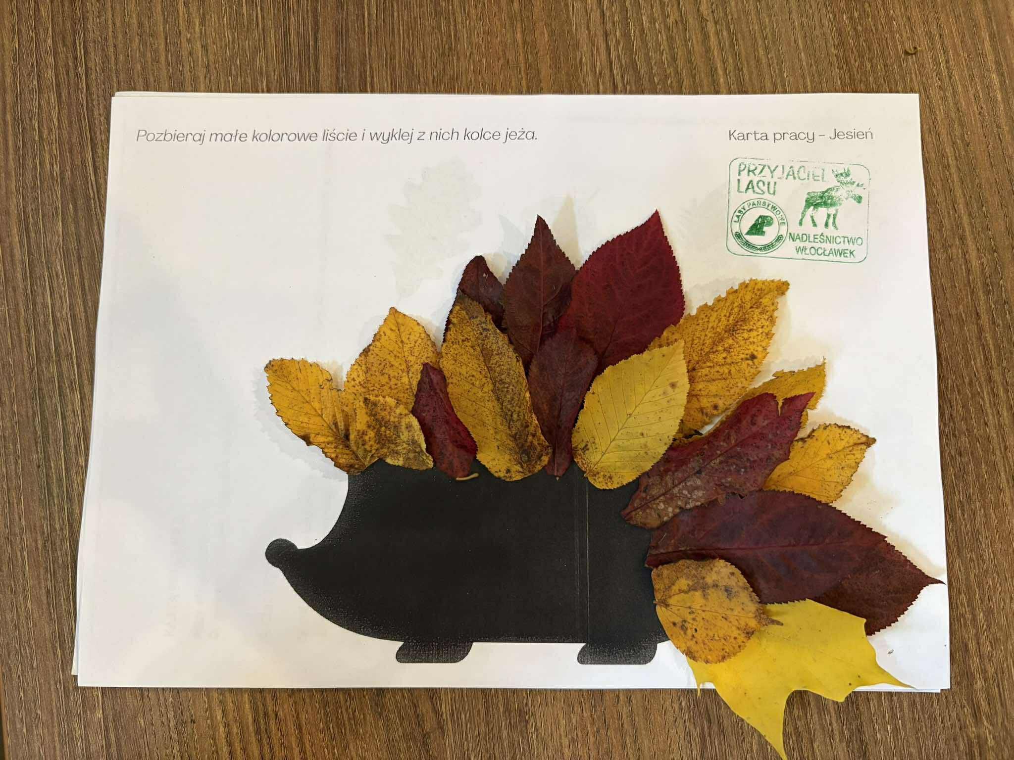 Podczas wizyty w Nadleśnictwie Włocławek poznawali tajemnice lasu – uczyli się rozpoznawać liście różnych drzew, zbierali je, a następnie wykorzystali do stworzenia pięknych prac plastycznych w kształcie jeżyka Nie zabrakło również spaceru po ścieżce edukacyjnej.