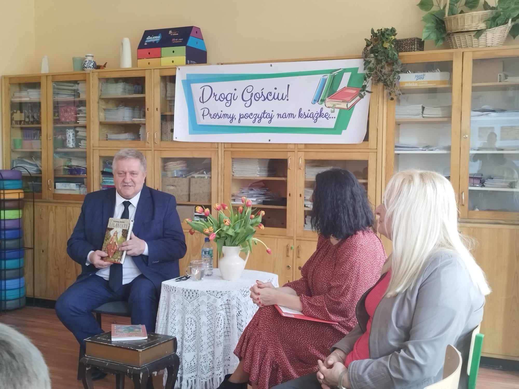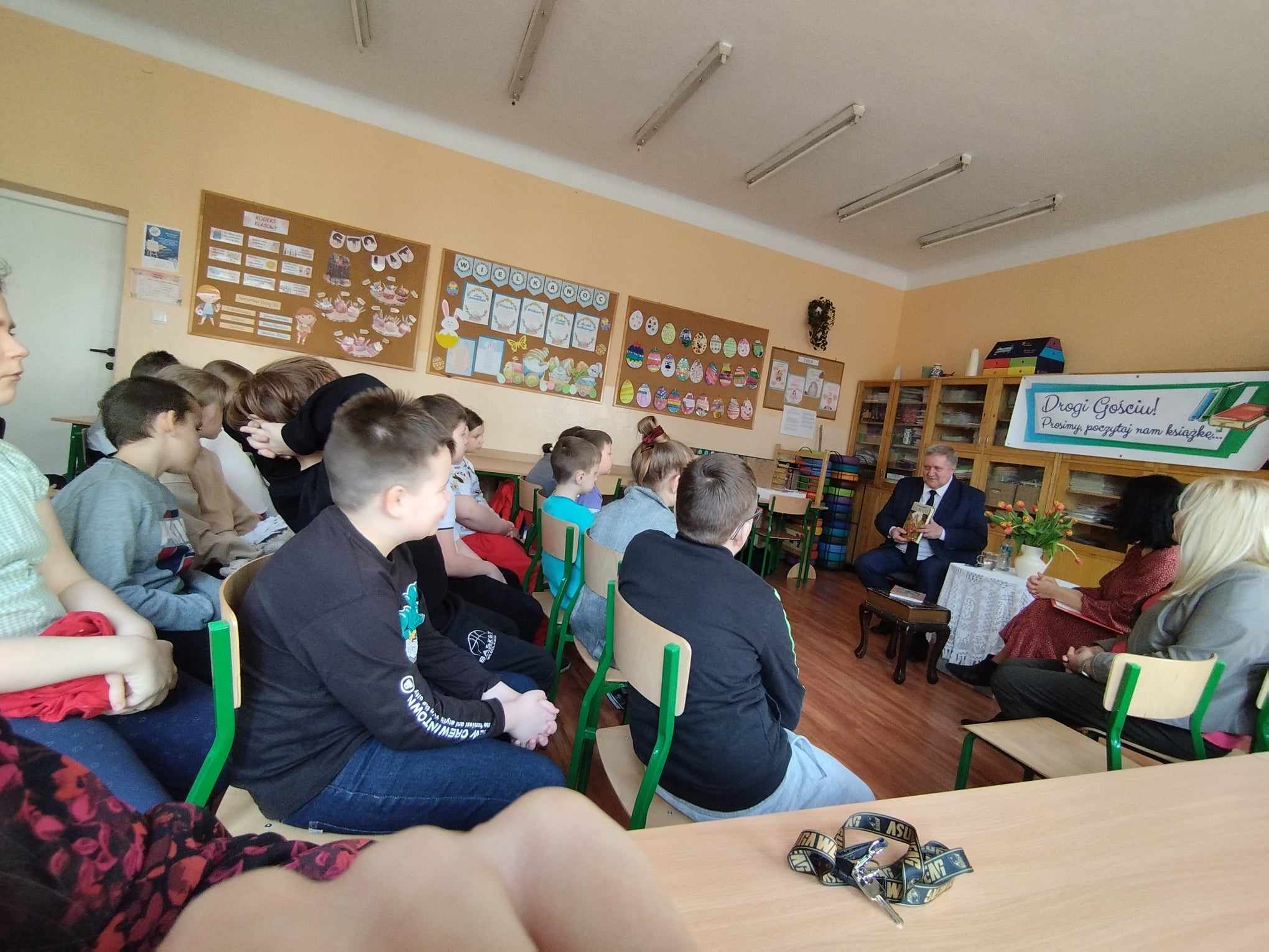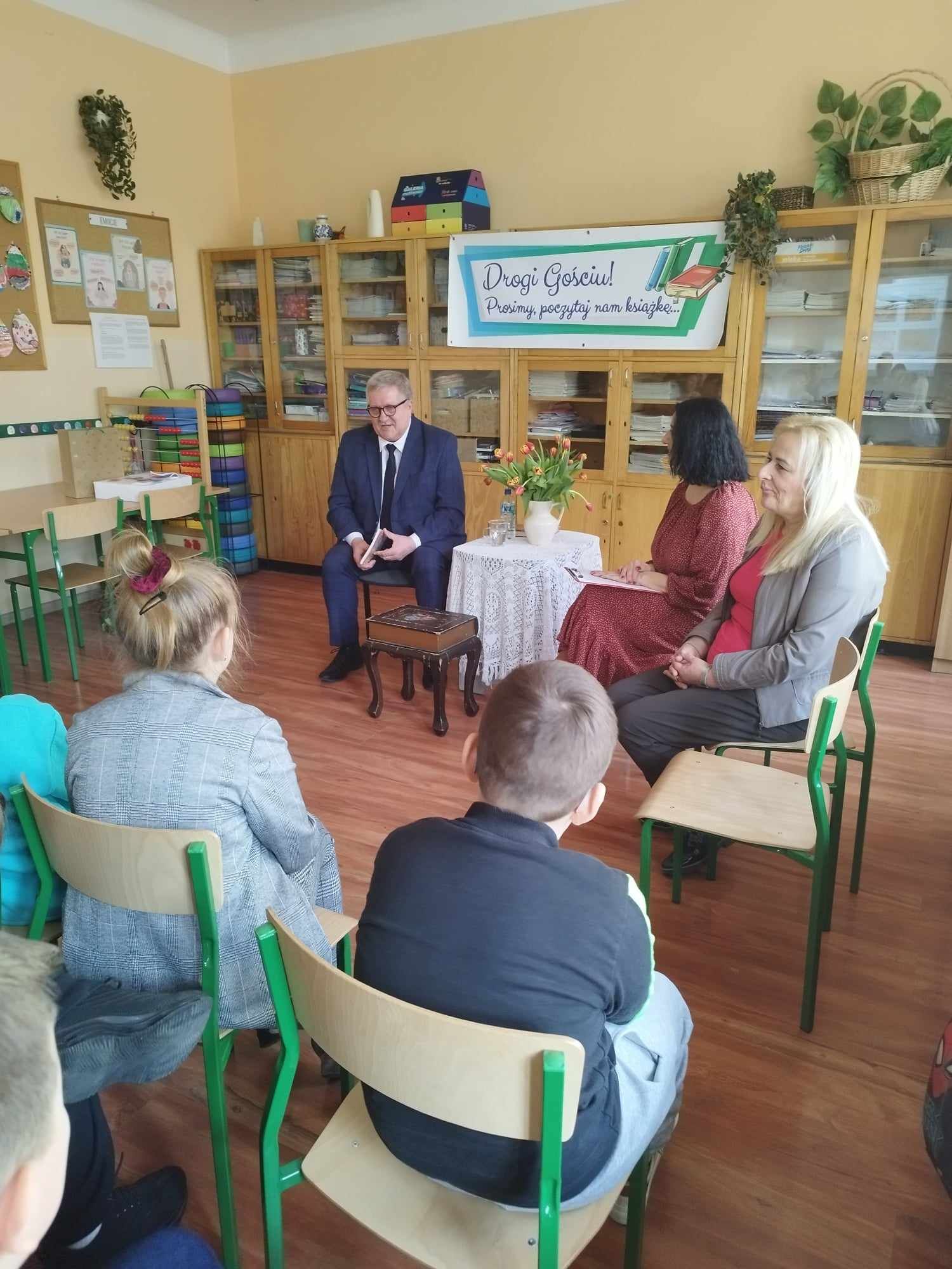 ,,Drogi Gościu, prosimy, poczytaj nam książkę” Powyższe tytuł odnosi się do cyklicznych spotkań ze znanymi osobistościami naszego miasta, którzy prezentują nam swoje ulubione lektury. Nierzadko stanowiły dla nich drogowskaz w codziennych życiu i były wyznacznikiem postaw życiowych. Kolejnym zaproszonym Gościem był Pan Sławomir Kopyść- Członek Zarządu Wojewodztwa Kujawsko-Pomorskiego, nauczyciel. Zaproszony Gość zaprezentował nam swoją ważną książkę a także przeczytał uczniom wybrane wiersze Jana Brzechwy- a wszystko to- w ramach propagowania czytelnictwa wśród dzieci i młodzieży. Niewątpliwie ważnym elementem spotkania była również rozmowa- wywiad z zaproszonym Gościem. Pytania zadawane są przez uczniów aby poznać bliżej szkolne perypetie czy też przygody z uczniowskiej ławki zaproszonej Osoby. Spotkanie przebiegło w niesamowicie miłej atmosferze. Uczniowie kl.3a zaśpiewali piosenkę a także zaprosili Pana Sławomira Kopyścia do wspólnej zabawy. Dziękujemy za wizytę. To było owocne spotkanie.