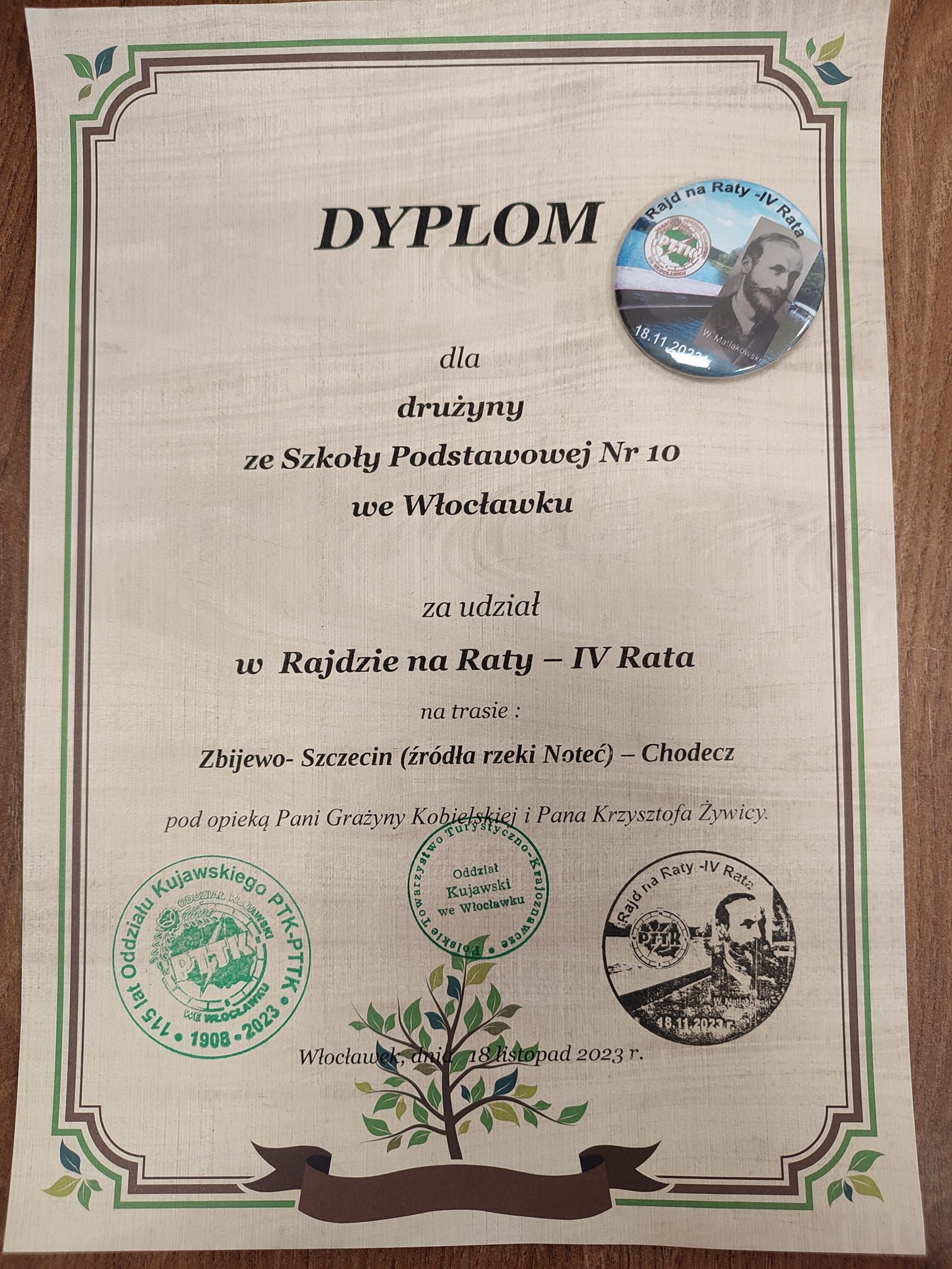 18 listopada odbył się ostatni w tym roku rajd z cyklu na raty organizowany przez włocławski oddział PTTK. Trasa rajdu przebiegała od wsi Zbijewo przez Szczecin do Chodcza i wynosiła ok.9km. W czasie rajdu poznaliśmy historię dr Władysława Matlakowskiego, który był chirurgiem, jednym z pierwszych badaczy kultury podhalańskiej i tłumaczem z języka angielskiego . Związany był z Kujawami przez małżeństwo, mieszkał i zmarł w Zbijewie. Odwiedziliśmy park dworski w Zbijewie, gdzie stał dwór Matlakowskich i pozostały w nim cztery dęby z których najstarszy liczy ok. 800 lat. Następnie pomaszerowaliśmy do Chodcza, gdzie na cmentarzu założonym przez Jakuba Zygmunta Kretkowskiego w 1799 roku odwiedziliśmy kolumbarium, gdzie pochowani są mieszkańcy Chodcza i okolic. Odwiedziliśmy także grób Władysława Matlakowskiego, pochowanego na tym szczególnym cmentarzu. Potem udaliśmy się nad piękne jezioro Chodeckie, gdzie uczestniczyliśmy w „Zgaduj- zgaduli” rajdowej. Nasza drużyna zdobyła pierwsze miejsce. Na zakończenie organizatorzy przygotowali ognisko z kiełbaskami. W rajdzie wzięli udział uczniowie z kl.: 4b, 5a, 6b,7a pod opieką p. Grażyny Kobielskiej i p. Krzysztofa Żywicy.