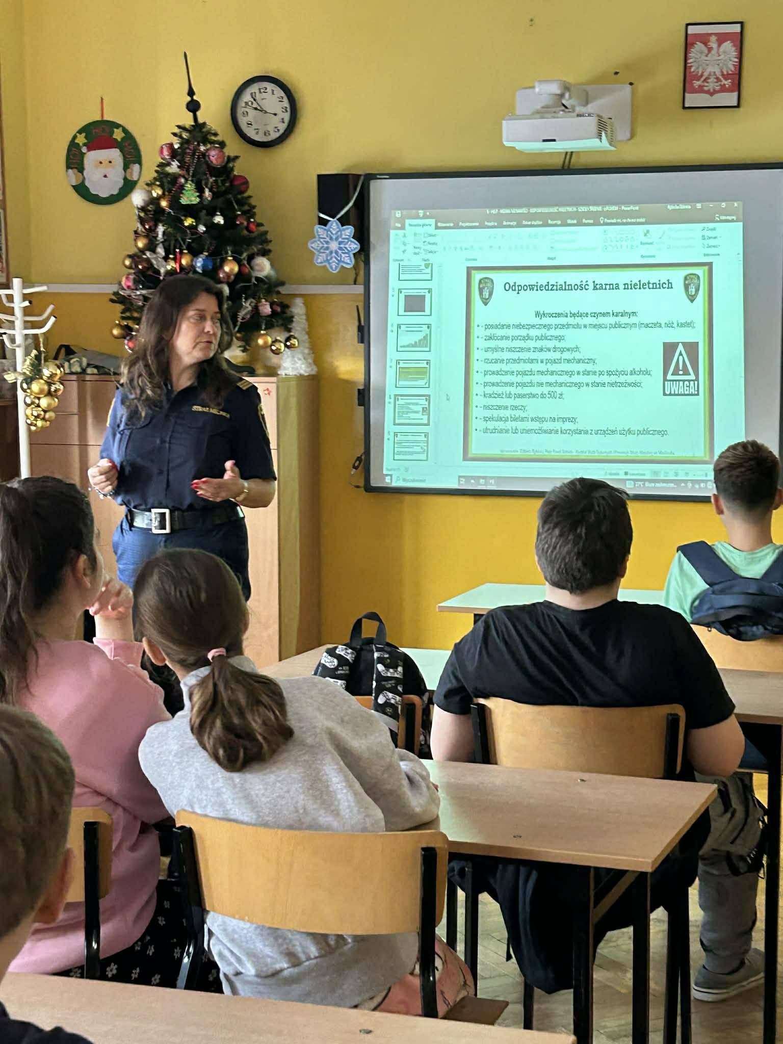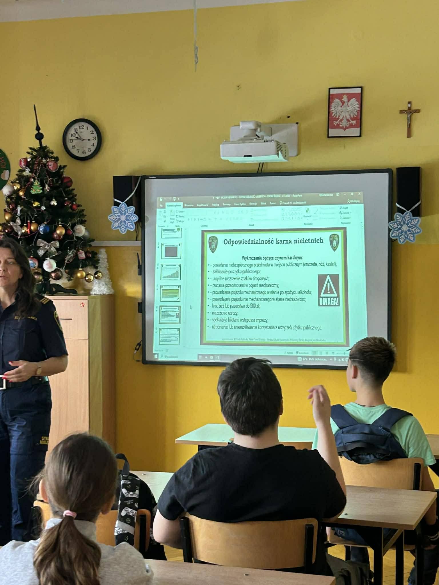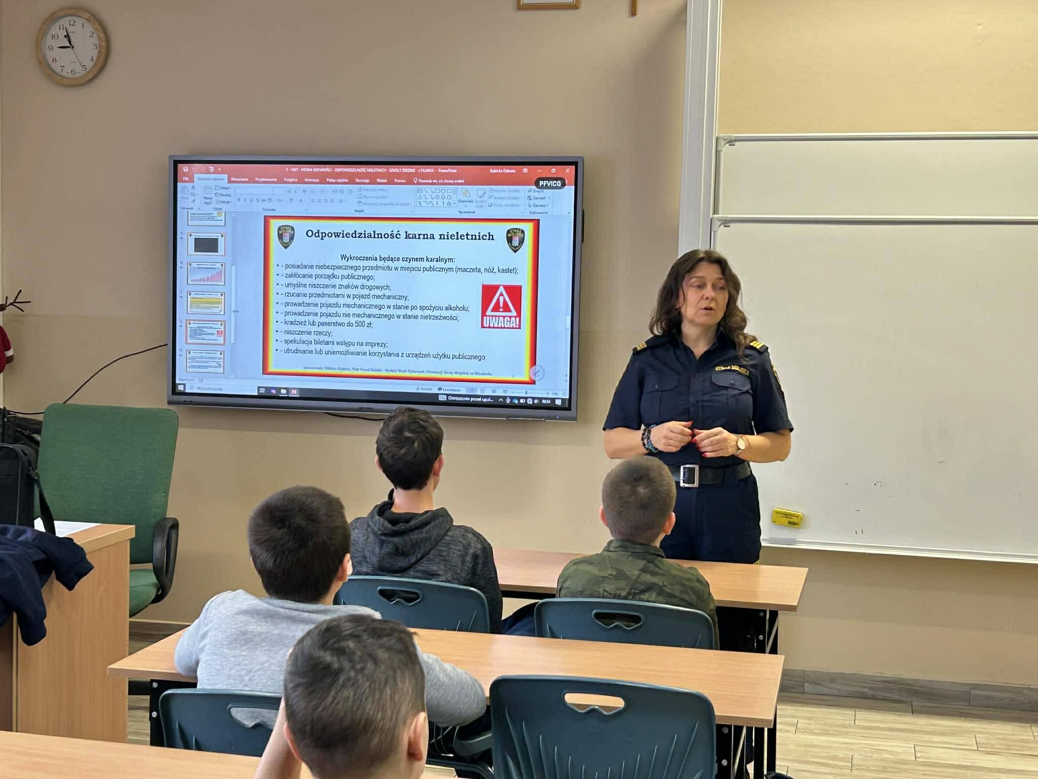 Uczniowie dowiedzieli się o różnych zagrożeniach i konsekwencjach, które mogą zostać wdrożone w sytuacjach łamania prawa.