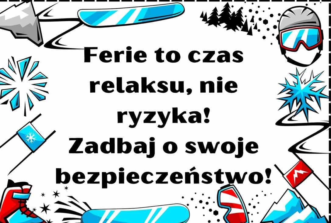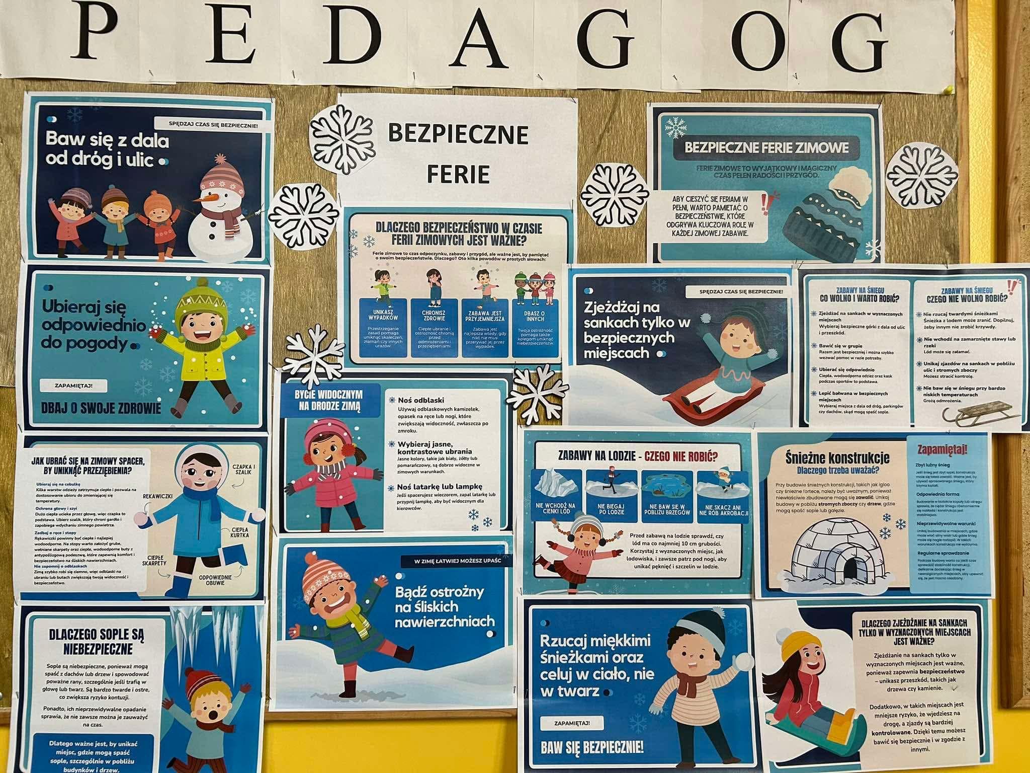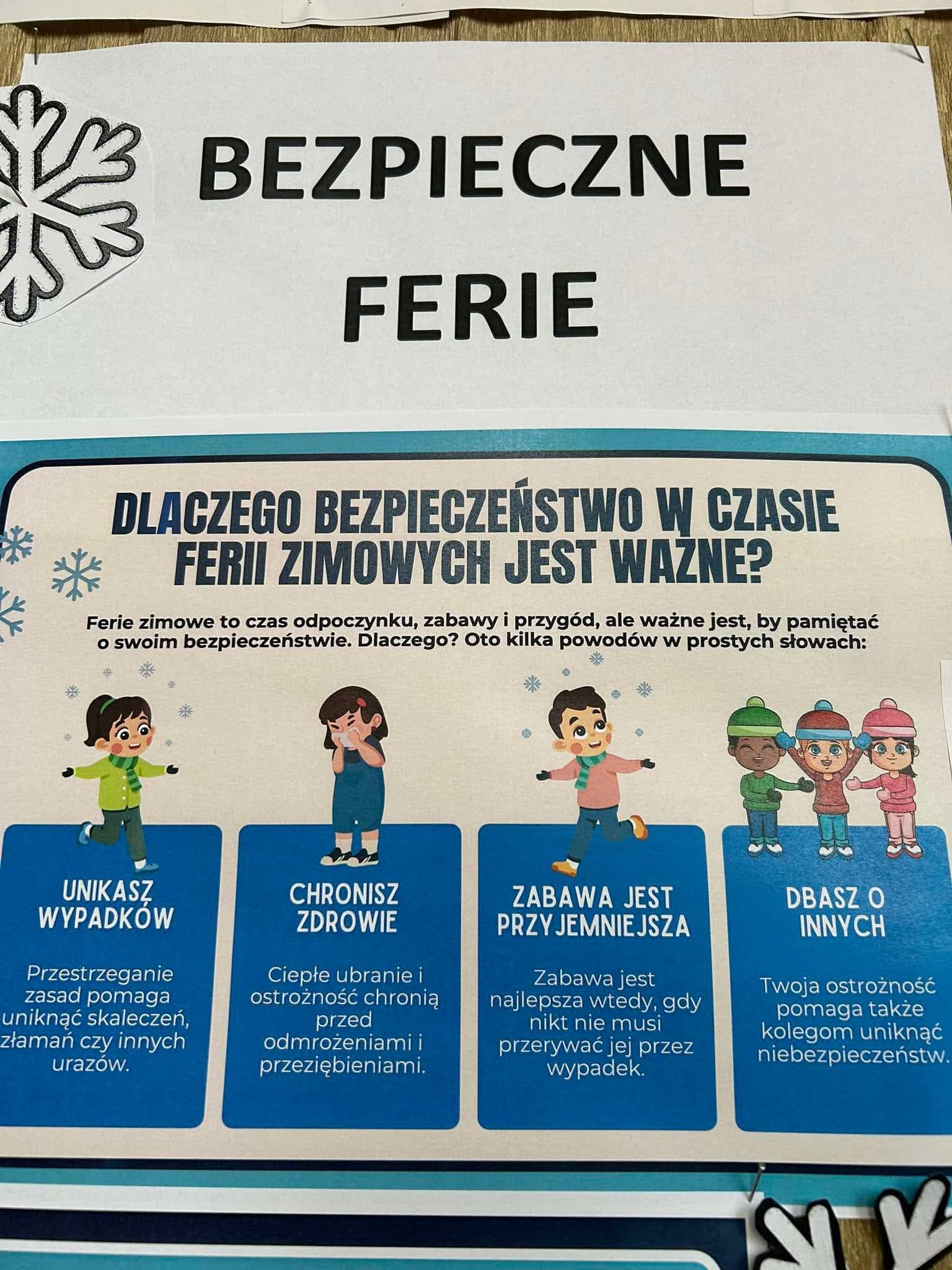 BEZPIECZNE FERIE-c.d. I mamy ferie .Staraliśmy się właściwie do nich przygotować.Od poniedziałku uczniowie wszystkich klas na różnych zajęciach rozmawiali o zasadach bezpieczeństwa podczas wypoczynku feryjnego.Oglądali filmiki,prezentacje,gazetki, wykonywali prace plastyczne . W piątek szef Biura Prasowego SU Mateusz,przypomnial przez szkolny radiowęzeł najważniejsze zasady bezpieczeństwa. Wszystkim naszym uczniom życzymy zasłużonego wypoczynku,wielu spacerów,spotkań na świeżym powietrzu,zabaw na śniegu,rozwijania zainteresowań. BEZPIECZNYCH FERII ![]()