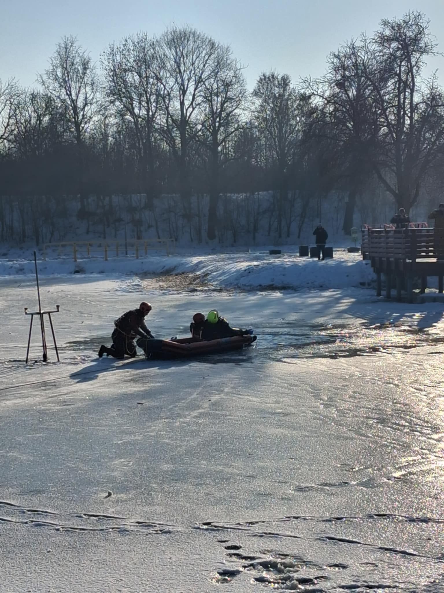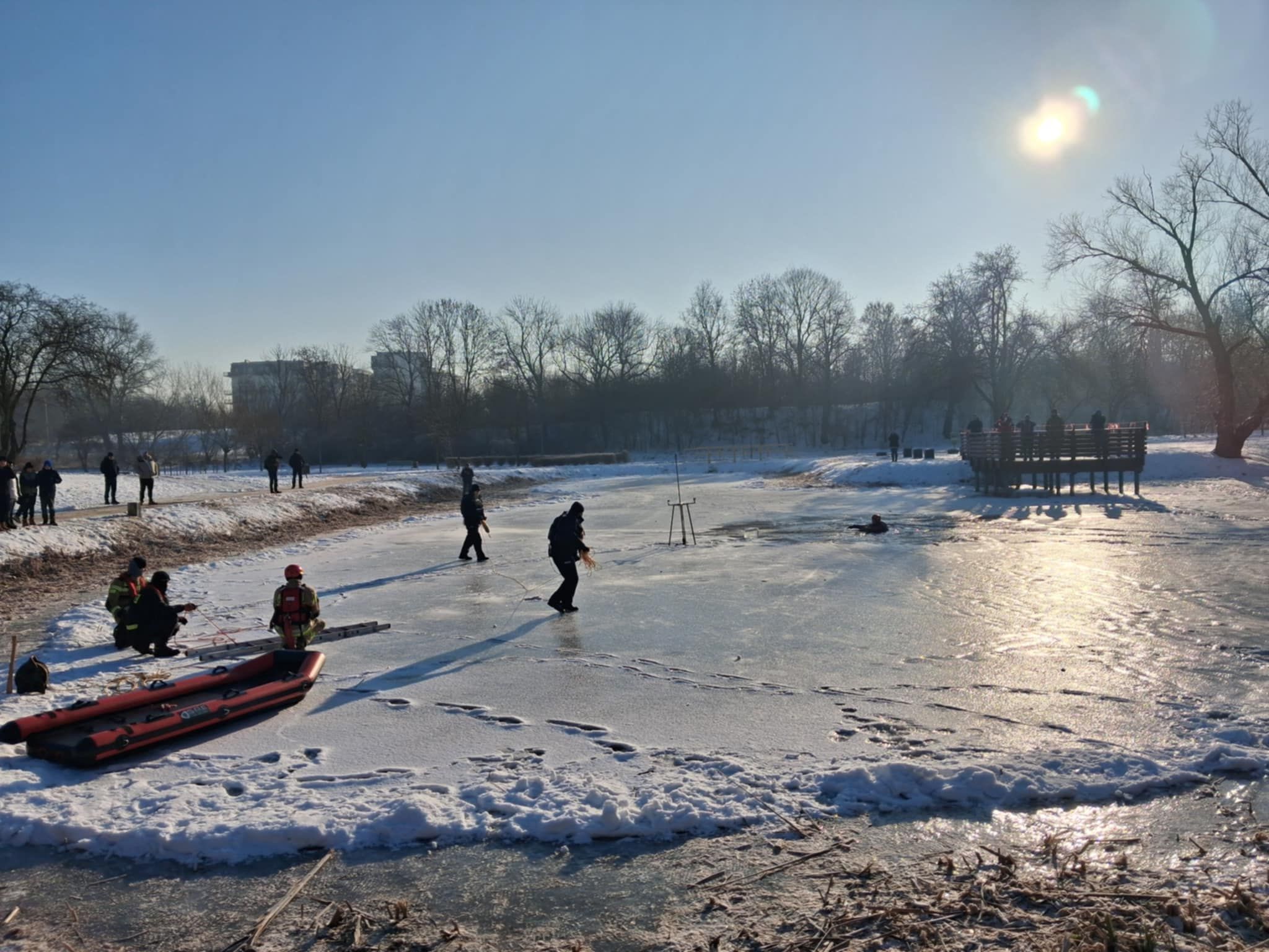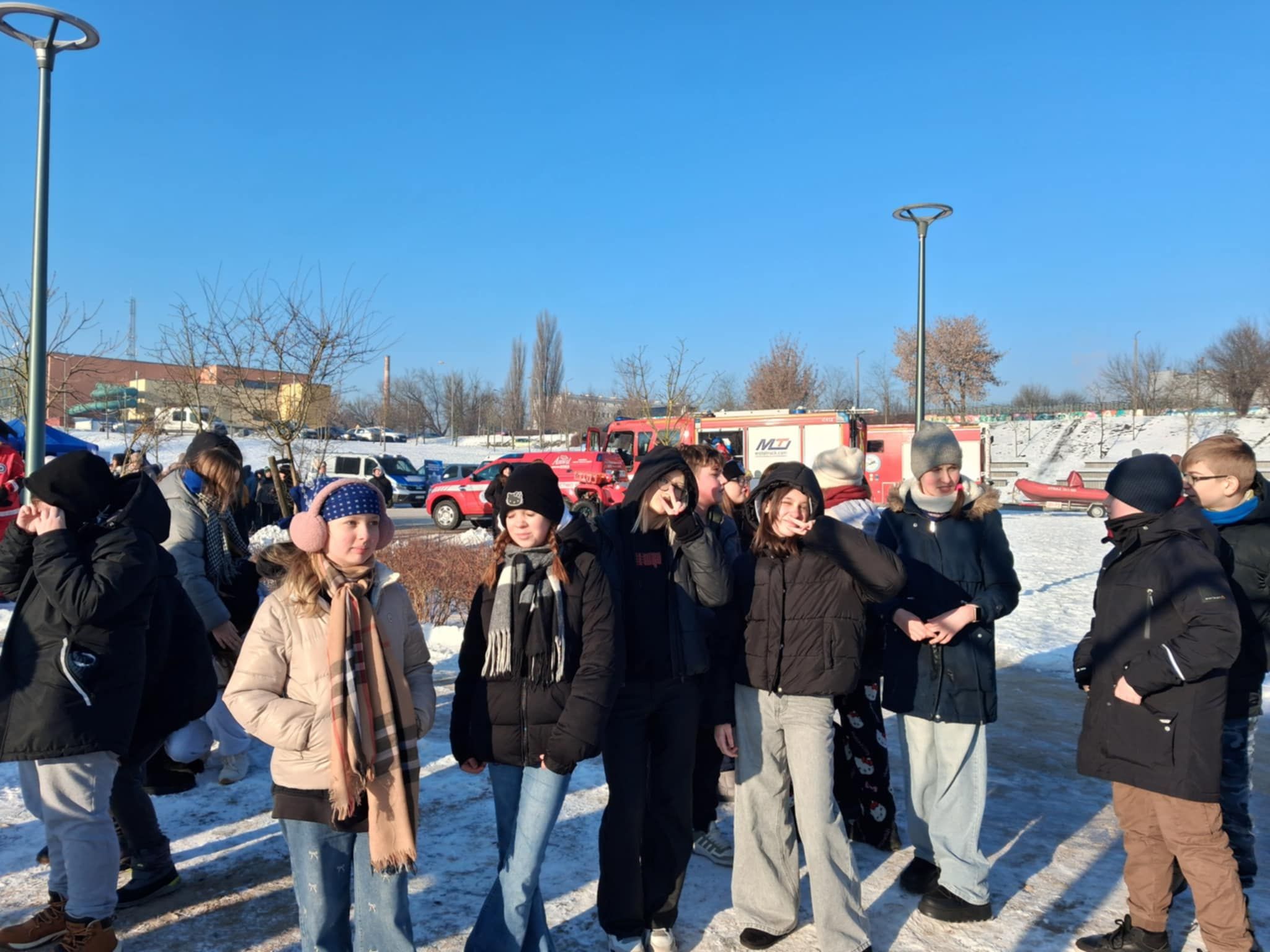 Klasy szóste naszej szkoły 20 stycznia wzięły udział w akcji ,,Bezpieczne ferie 2026" zorganizowanej przez WOPR, Policję i Straż Pożarną. Dzięki srogiej zimie na zamarzniętym zbiorniku wodnym mogły odbyć się pokazy instruktażowe, jak ratować osoby, pod którymi załamał się lód. Uczniowie z ogromnym zainteresowaniem śledzili kolejne sposoby ratowania ofiar niebezpiecznych zachowań na zamarzniętych akwenach.