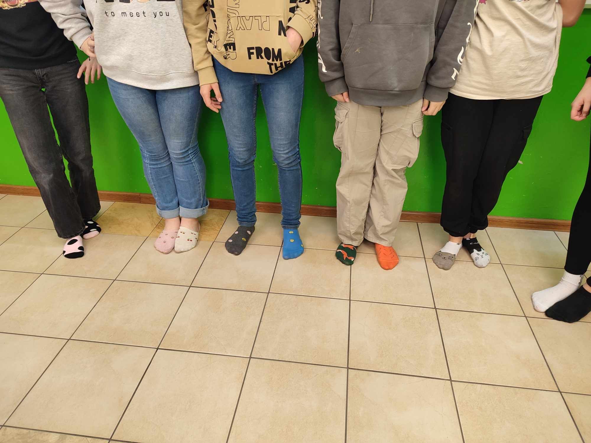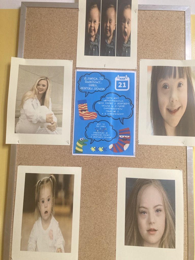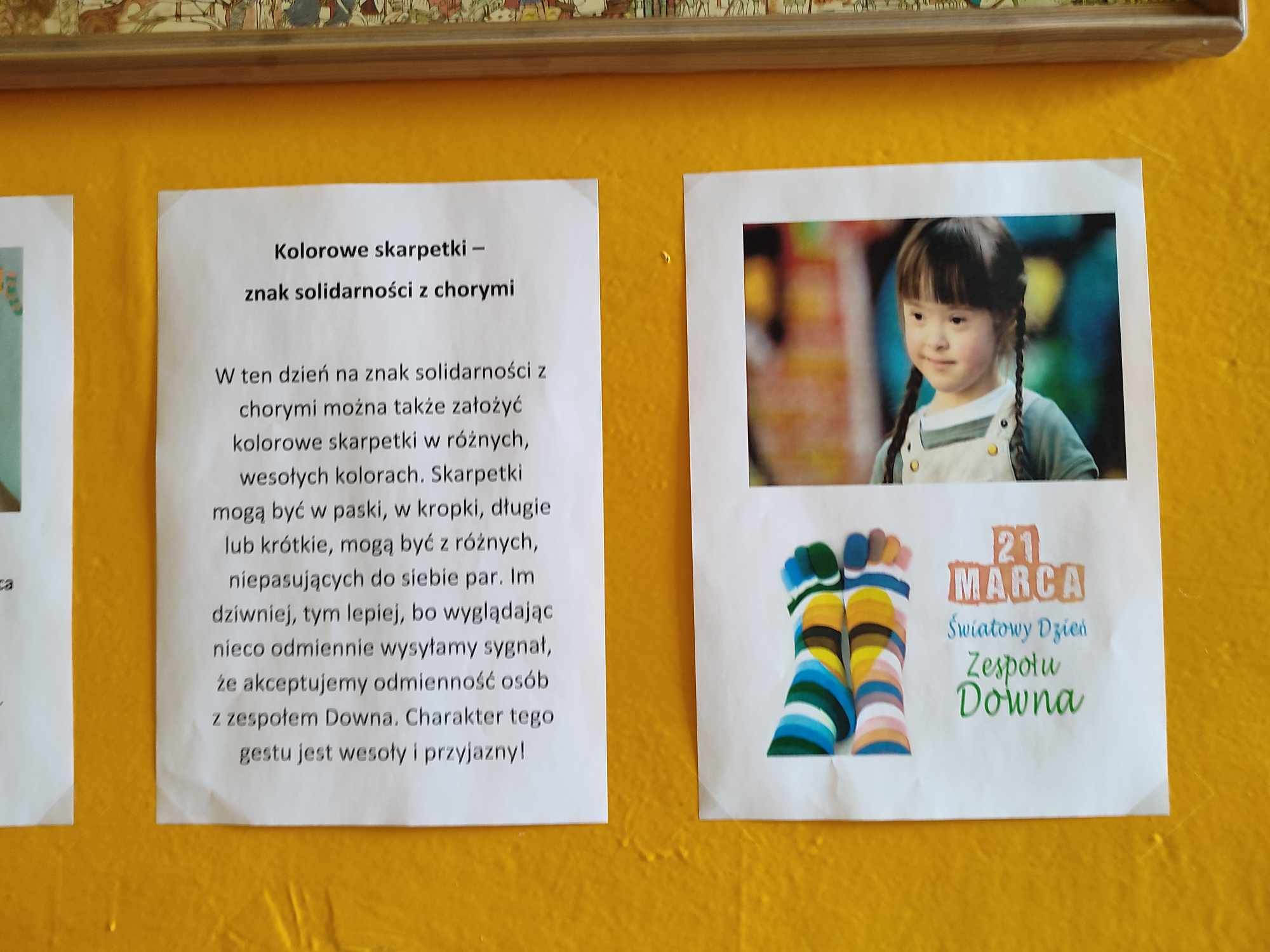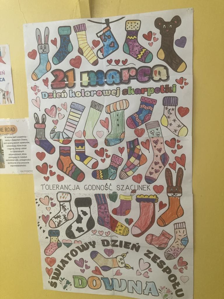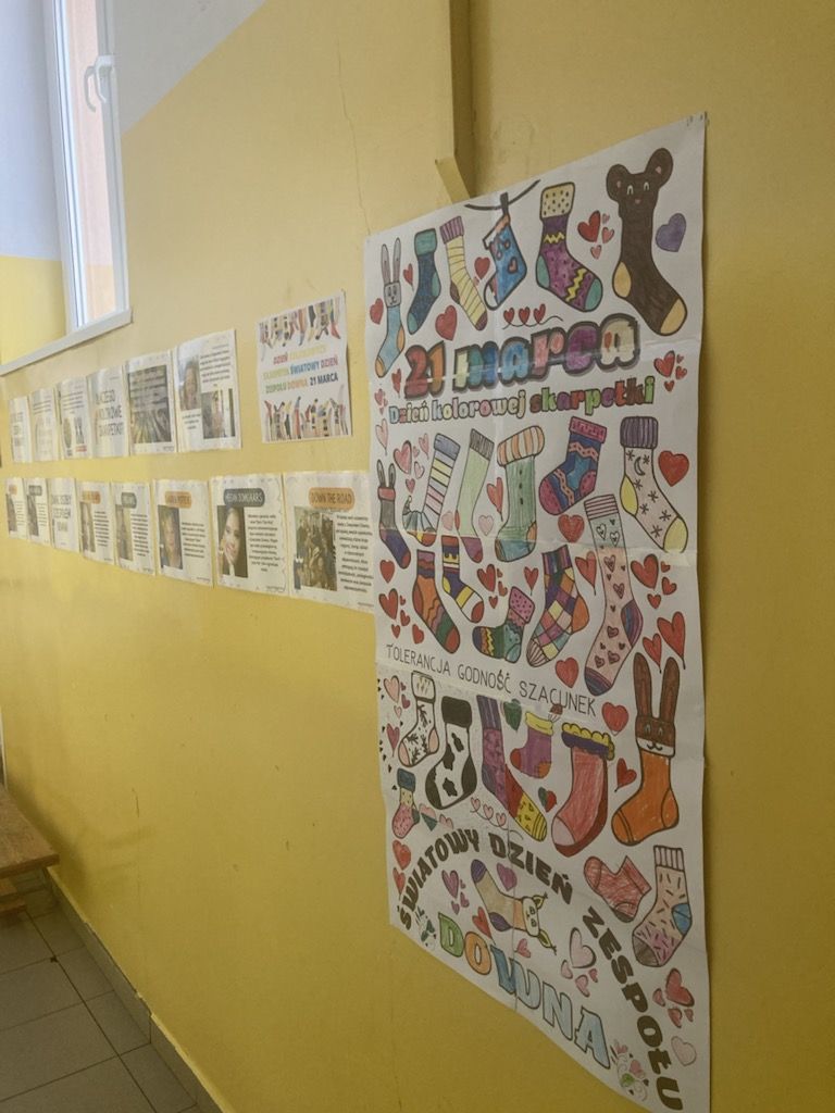 W Dniu Osób z Zespołem Downa uczniowie i pracownicy w geście solidarności założyli kolorowe skarpetki. Na różnych lekcjach ,zajęciach rozmawialiśmy na ten temat. Mogliśmy przyjrzeć się specyficznym cechom Zespołu Downa. Oglądaliśmy prezentacje, gazetki na korytarzach, projektowaliśmy kolorowe skarpetki. Wszystko utrwaliliśmy na zdjęciach