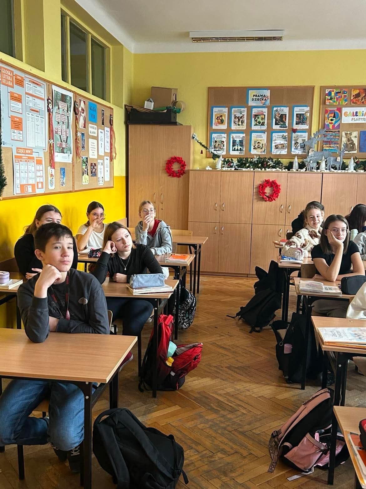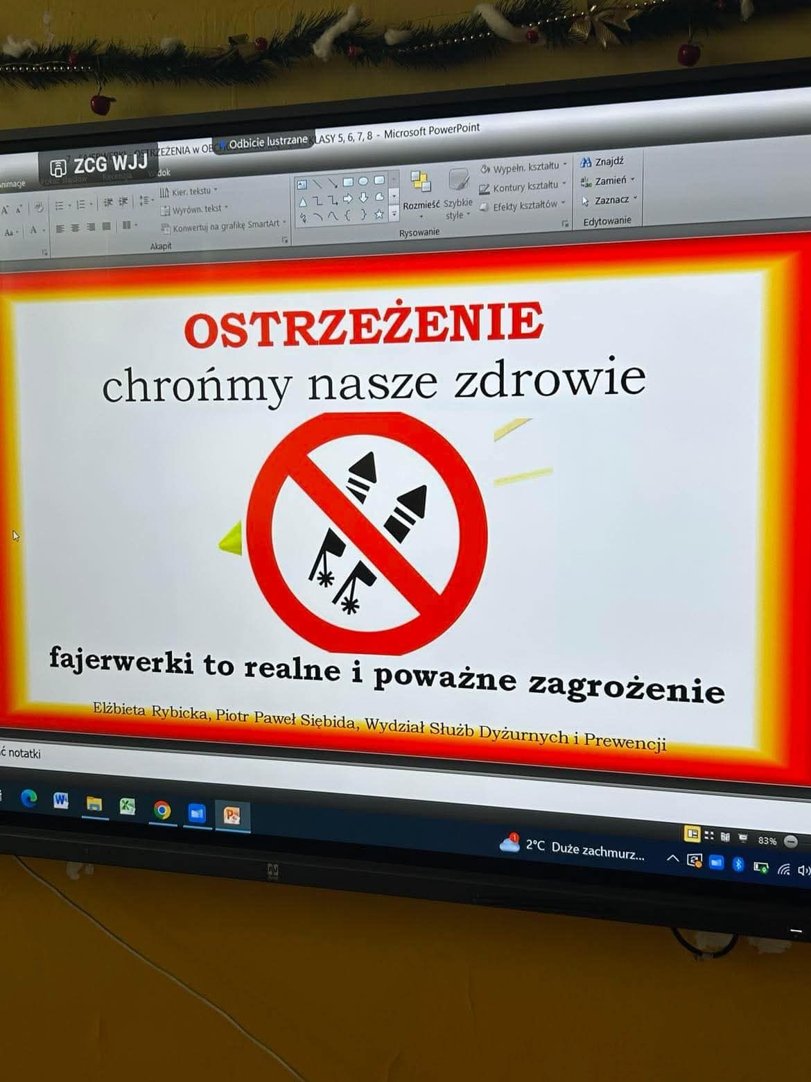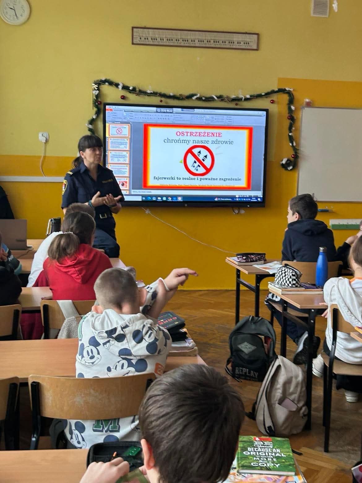W ramach akcji ,,Dziesiątka nie strzela w Sylwestra" klasy V i VI spotkały się 12 i 13.12.2024 r. z funkcjonariuszką Straży Miejskiej, p. Elżbietą Rybicką. Uczniowie zapoznali się z zasadami bezpieczeństwa, zagrożeniami płynącymi ze stosowania różnych petard, fajerwerków. Zagrożenie i niebezpieczeństwo dotyczy osoby zajmującej się detonacją materiału pirotechnicznego oraz wszystkich wokół, którzy są wyjątkowo wrażliwi na głośne dźwięki, ostre wystrzały świetlne. Chodzi tu o osoby starsze, chore, maleńkie dzieci, osoby z różnymi niepełnosprawnościami.Mamy na uwadze także zwierzęta, które umierają z powodu wystrzałów.