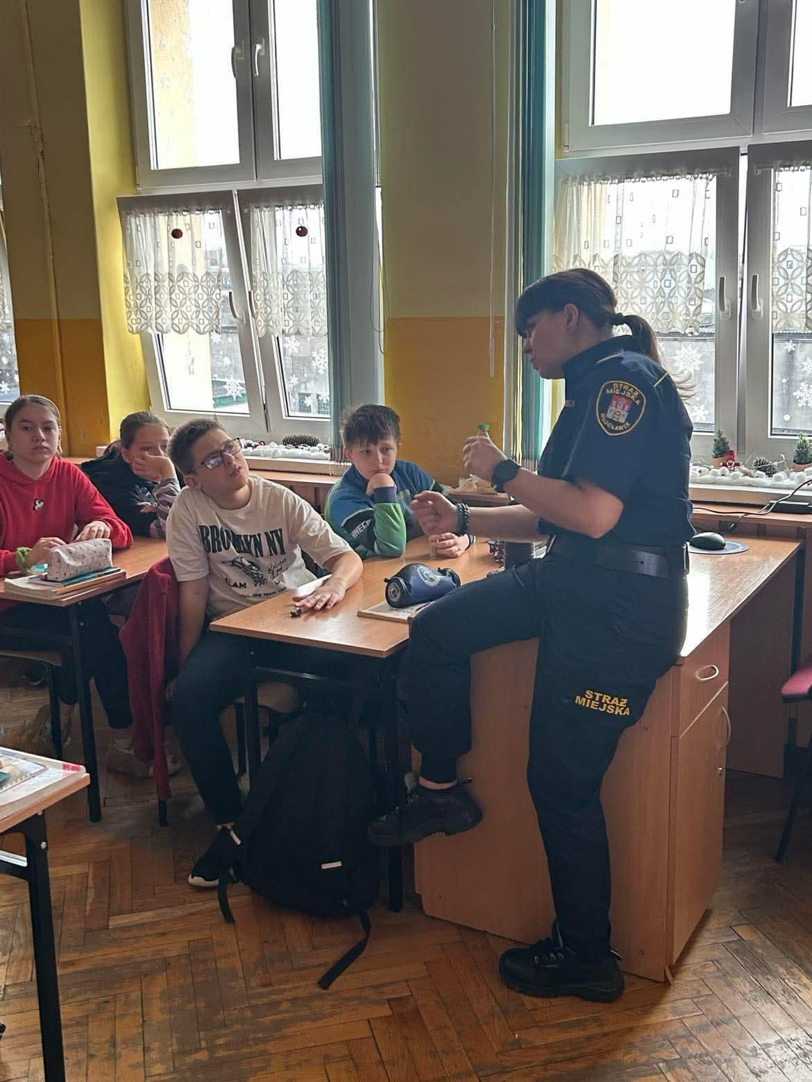 Uczniowie kl. V i VI rozmawiali ze Strażniczką Miejską o tych wszystkich ważnych sprawach oraz na temat bezdomności i reagowania na osoby znajdujące się w różnych zapomnianych miejscach.