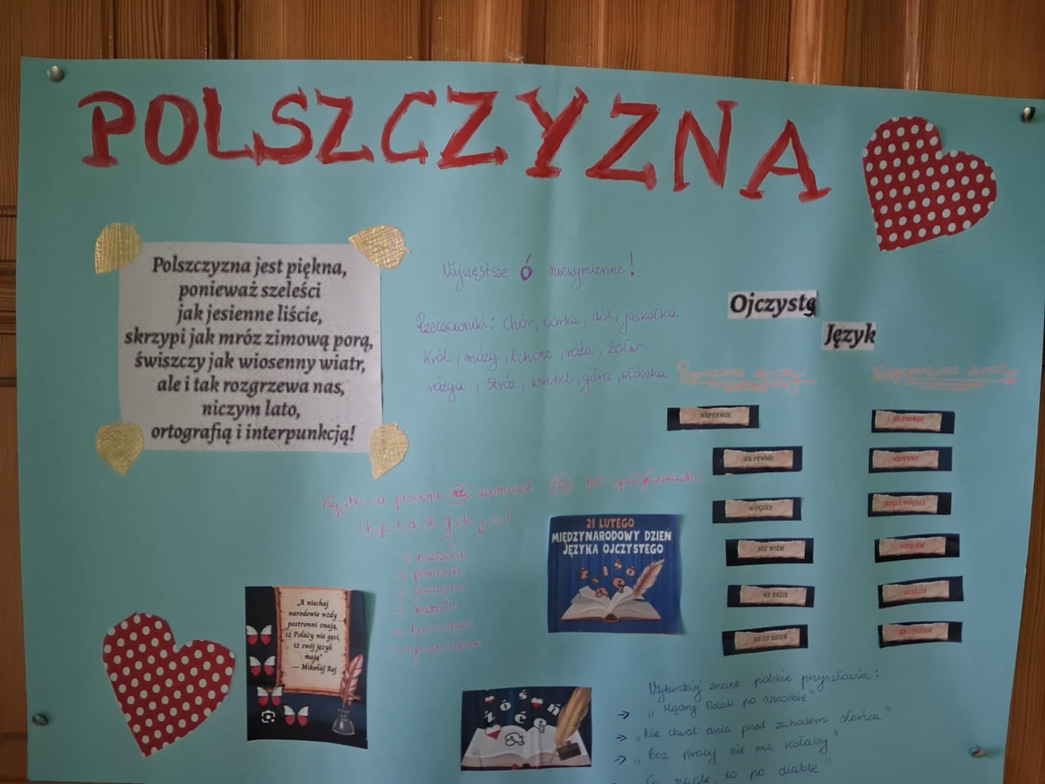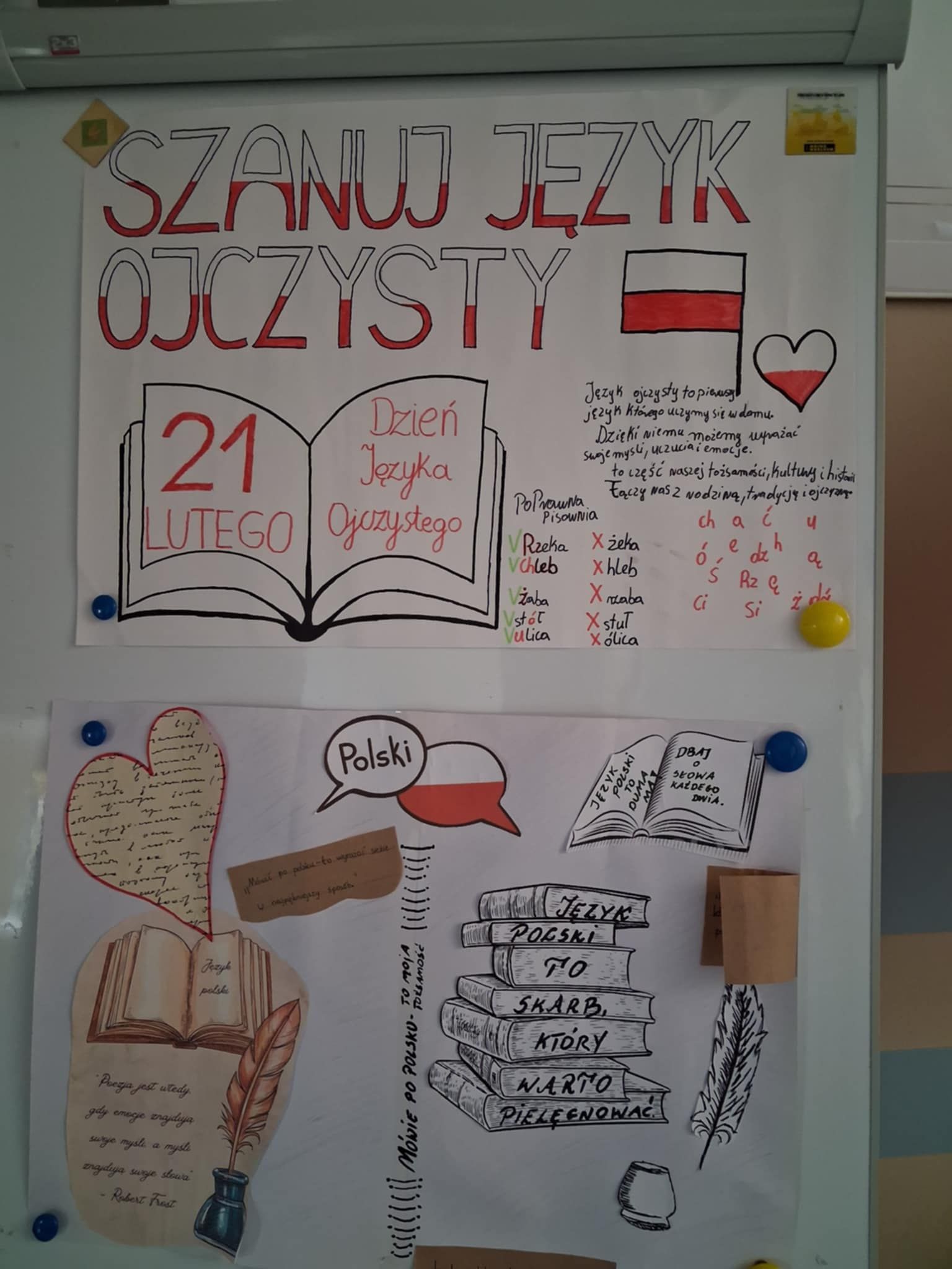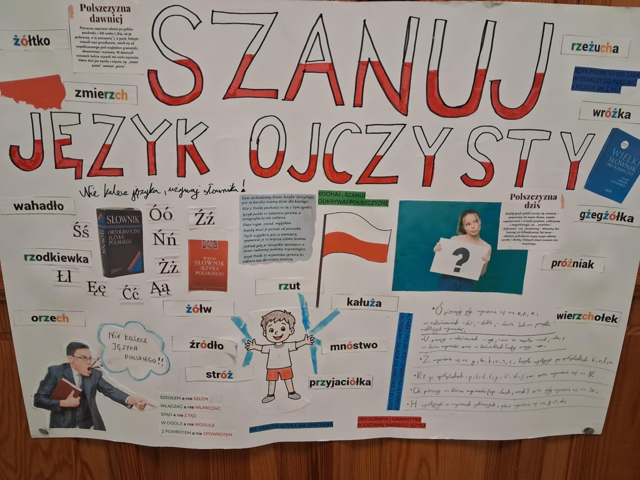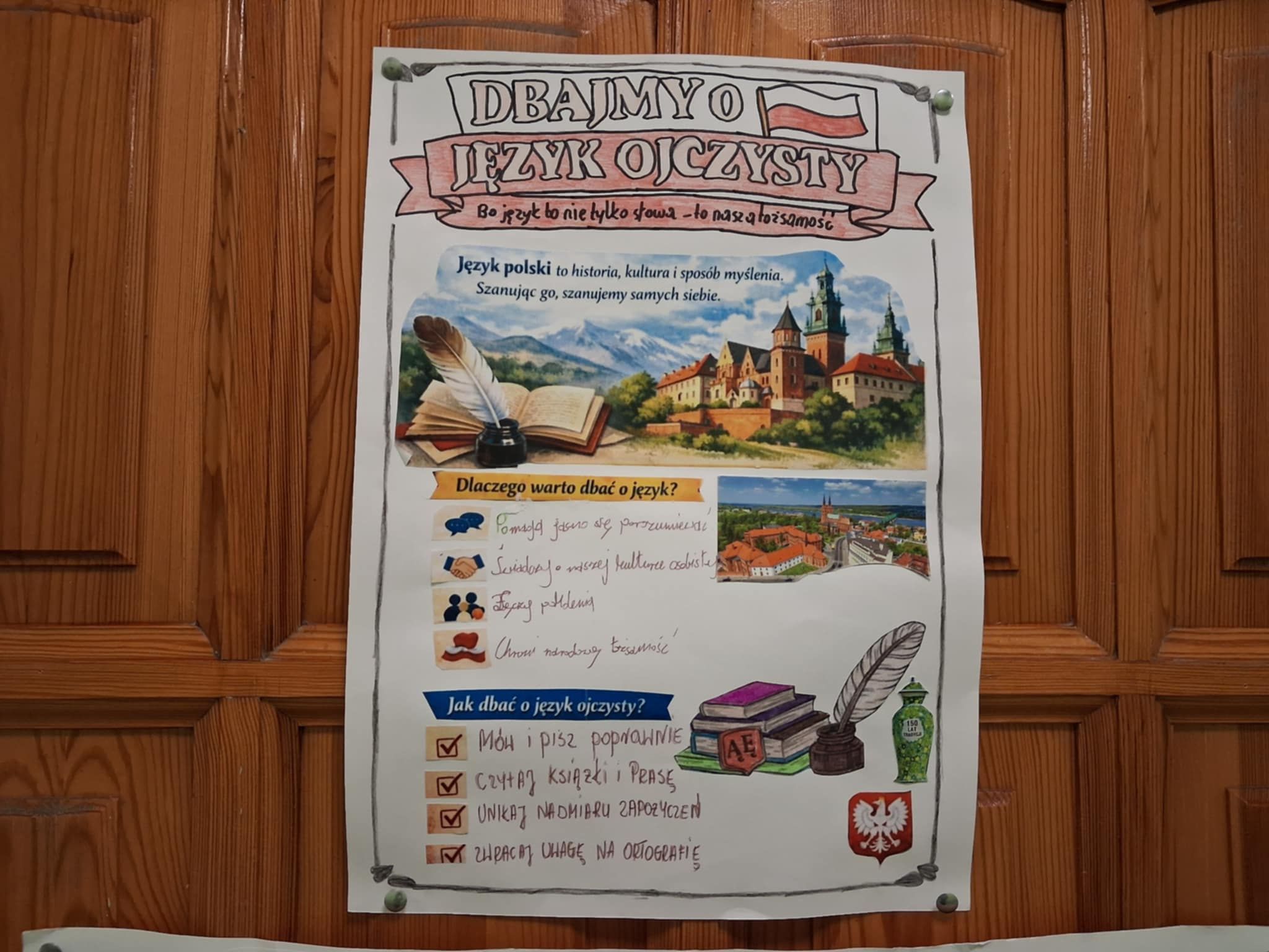 W naszej szkole 23 lutego uroczyście obchodziliśmy Międzynarodowy Dzień Języka Ojczystego, którego celem jest podkreślenie znaczenia języka polskiego, dbałości o poprawność językową oraz promowanie bogactwa polszczyzny. Z tej okazji zorganizowano szereg konkursów i wspólnych zabaw. Jednym z głównych punktów programu był konkurs na plakat promujący poprawność języka polskiego. Uczniowie wykazali się wyjątkową kreatywnością – pojawiły się hasła zachęcające do czytania, unikania błędów językowych, starannego mówienia oraz doceniania piękna naszego języka. Najciekawsze prace zostały wyeksponowane na szkolnym korytarzu. Dużym zainteresowaniem cieszyła się także akcja „Język polski na ubraniach”, w ramach której uczniowie mogli przyjść w koszulkach ozdobionych cytatami, przysłowiami, ciekawymi słowami lub zabawnymi grami słownymi. Inicjatywa ta zwróciła uwagę na to, jak codziennie otaczają nas słowa. Podczas obchodów odbywały się również gry i zabawy językowe, które miały na celu nie tylko poszerzenie wiedzy o języku polskim, ale także integrację uczniów. Wśród proponowanych aktywności znalazły się m.in.: łamańce, rozsypanki i kalambury językowe oraz zagadki gramatyczne. Tegoroczne obchody Dnia Języka Ojczystego upłynęły w atmosferze dobrej zabawy, ale również refleksji nad tym, jak ważne jest pielęgnowanie naszego języka. Uczniowie udowodnili, że język polski może być inspirujący, twórczy i pełen humoru.