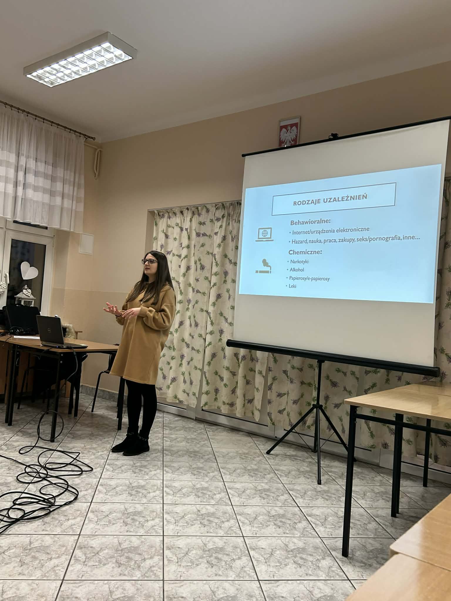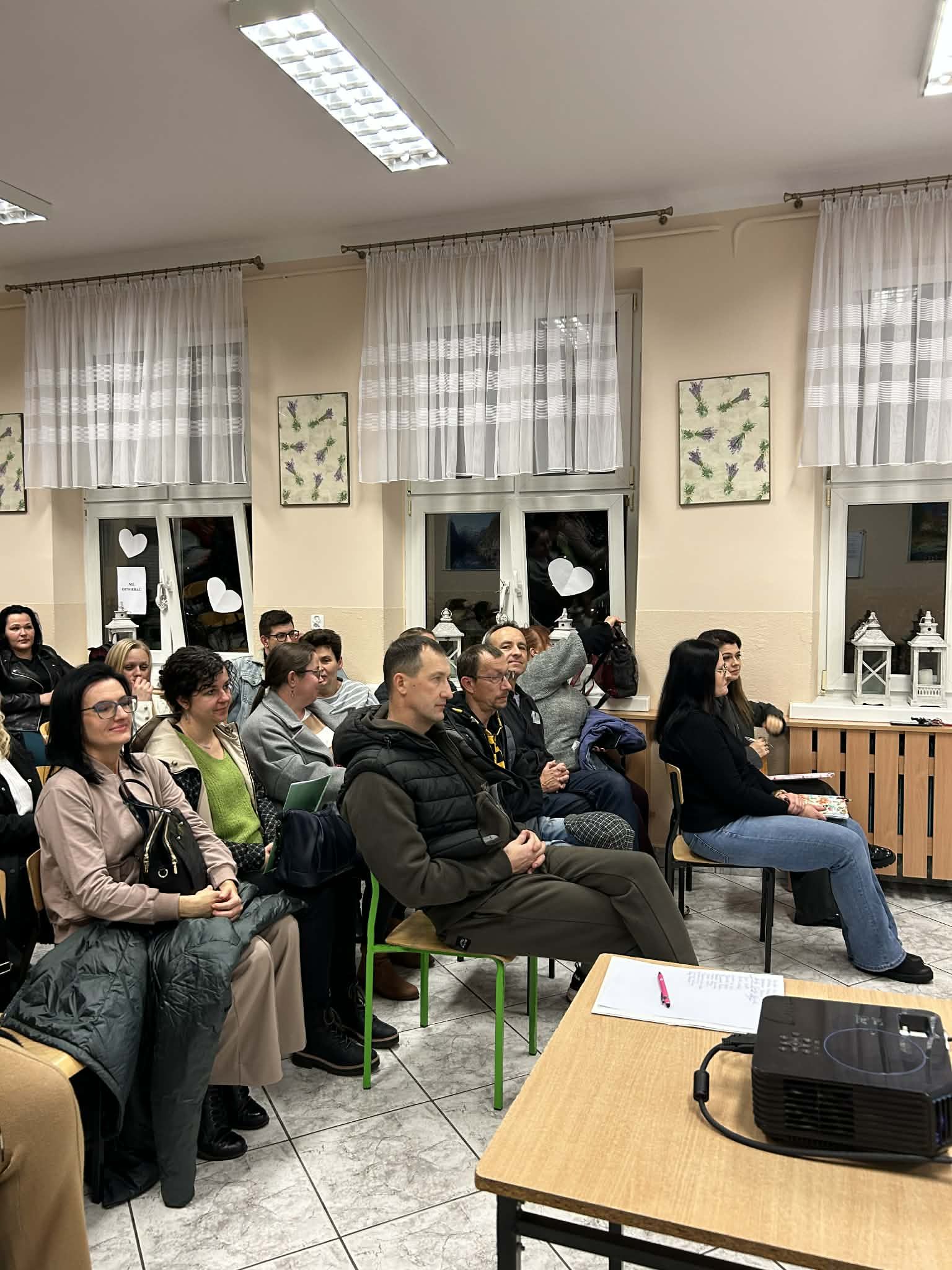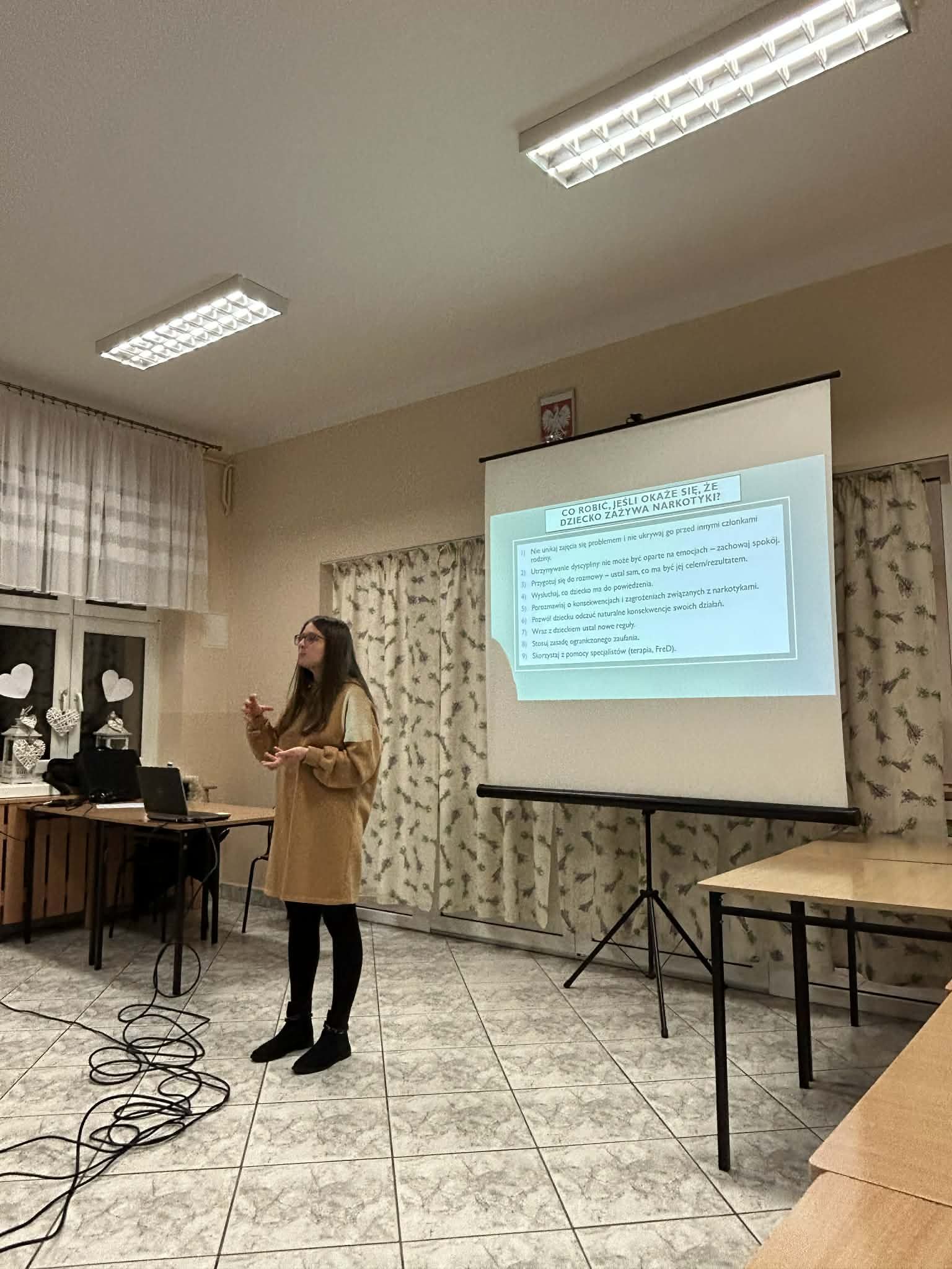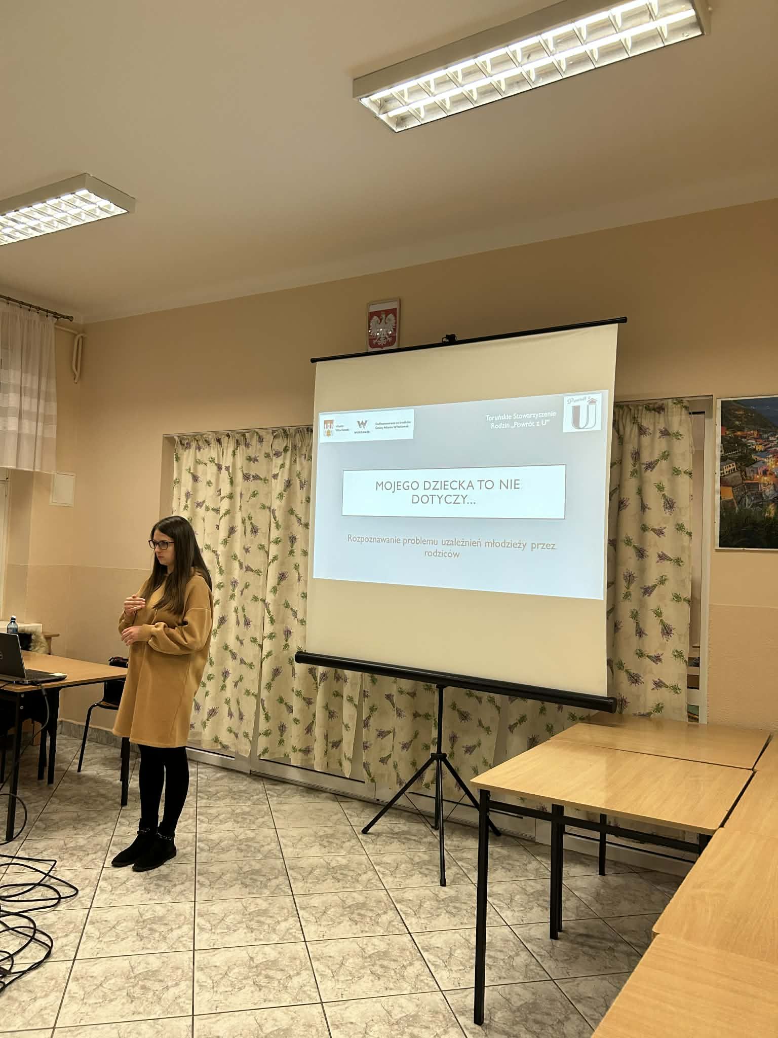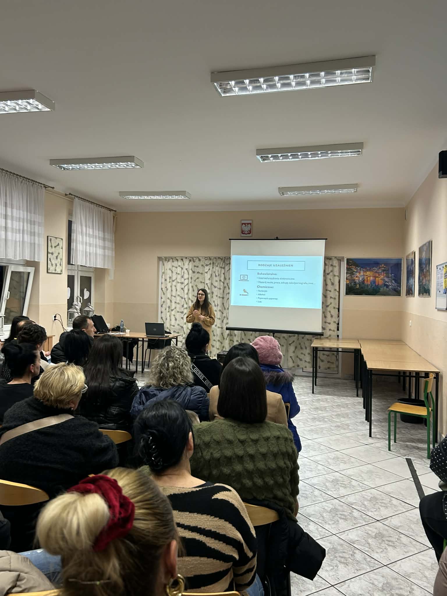 17 listopada rozpoczęliśmy cykl spotkań dla rodziców w ramach przedsięwzięcia ,,Szkoła dla Rodziców”. Pierwsze spotkanie to zajęcia z terapeutką Poradni Uzależnień ,,Powrót z U”, p. Weroniką Trzaskowską. Temat :,,Mojego dziecka to nie dotyczy… . Rozpoznawanie problemu uzależnień młodzieży przez rodziców”. Tematyka bardzo poważna, ale przekazana w swobodny i atrakcyjny sposób.