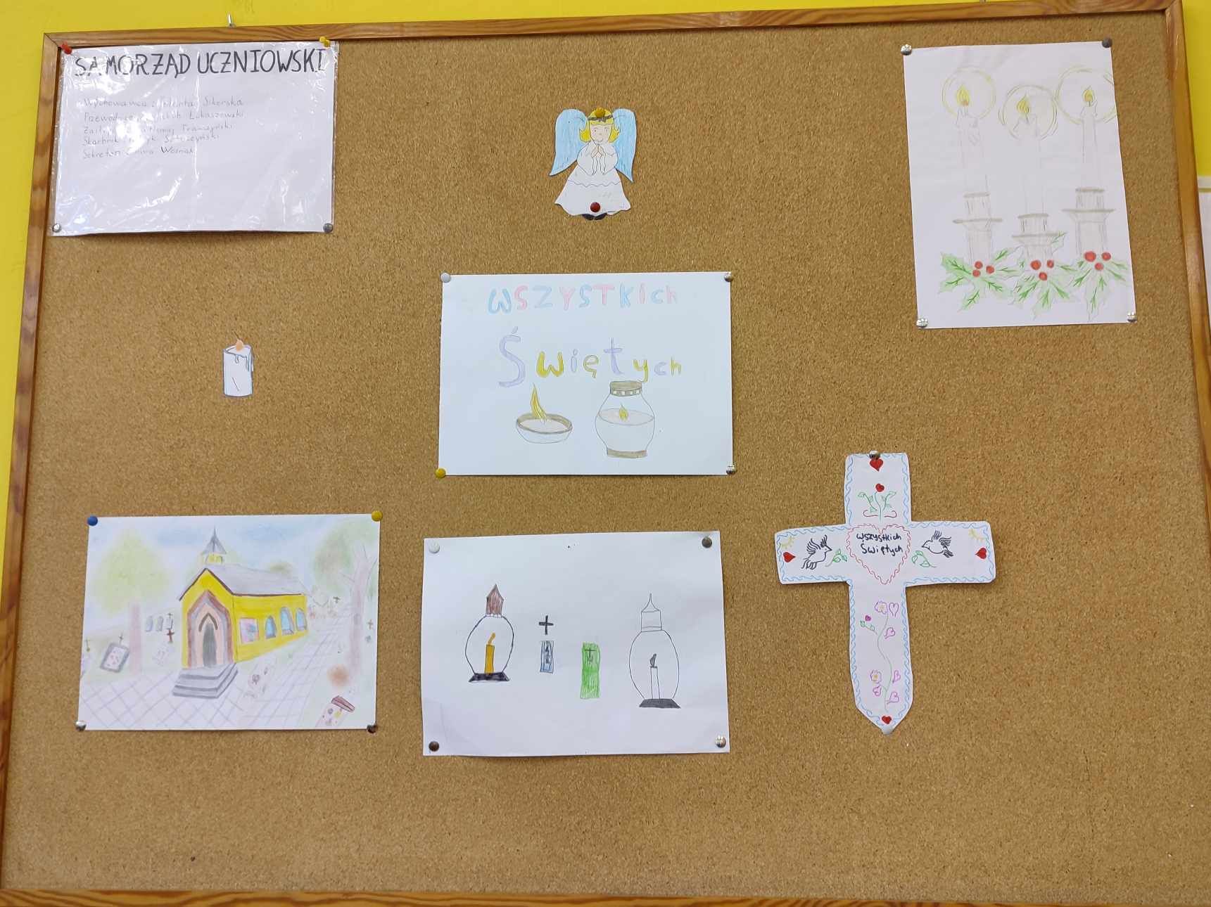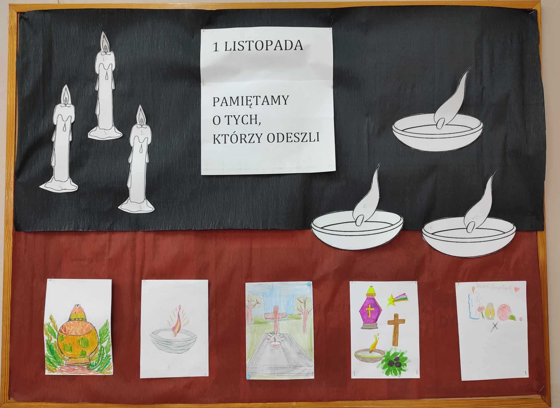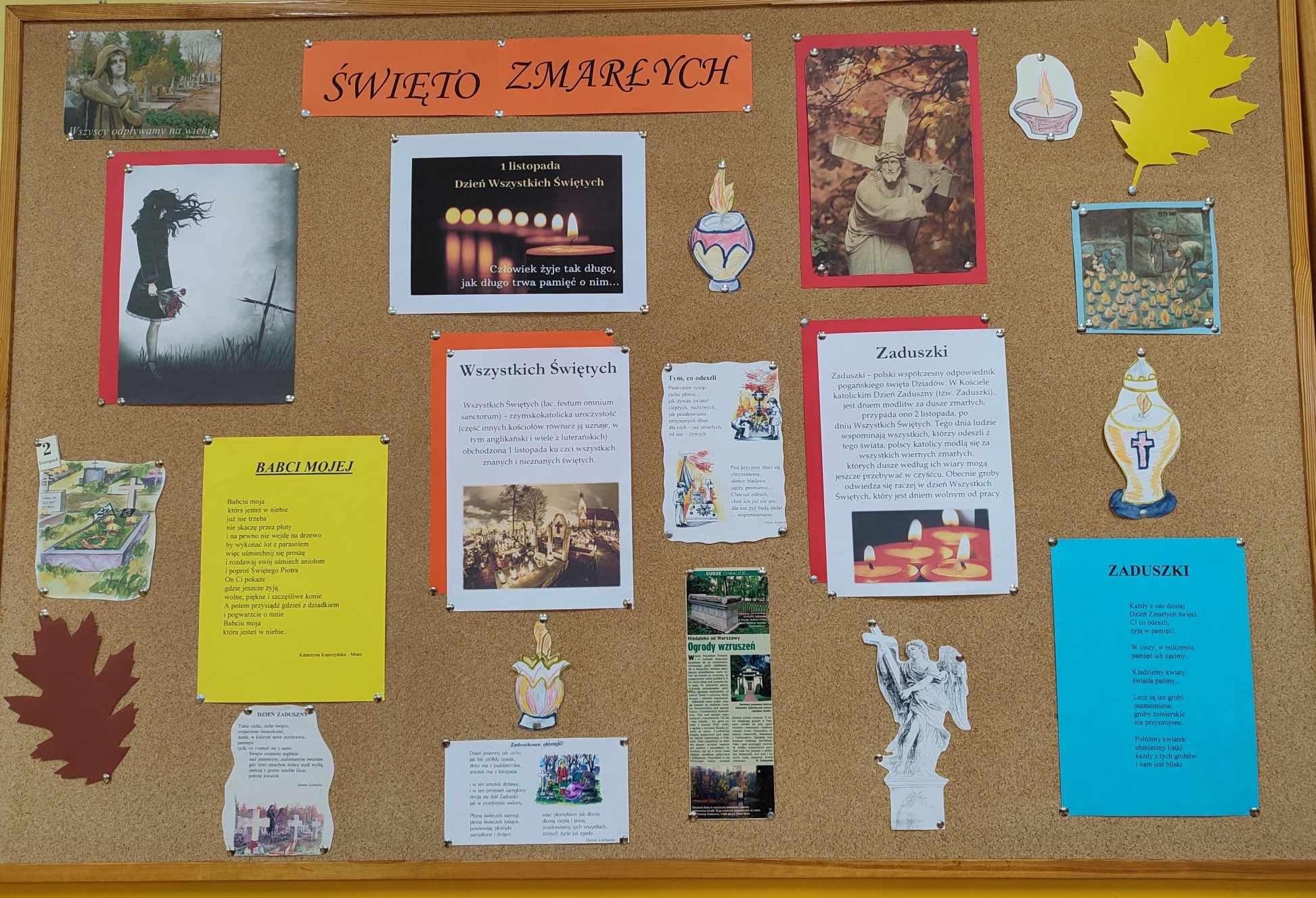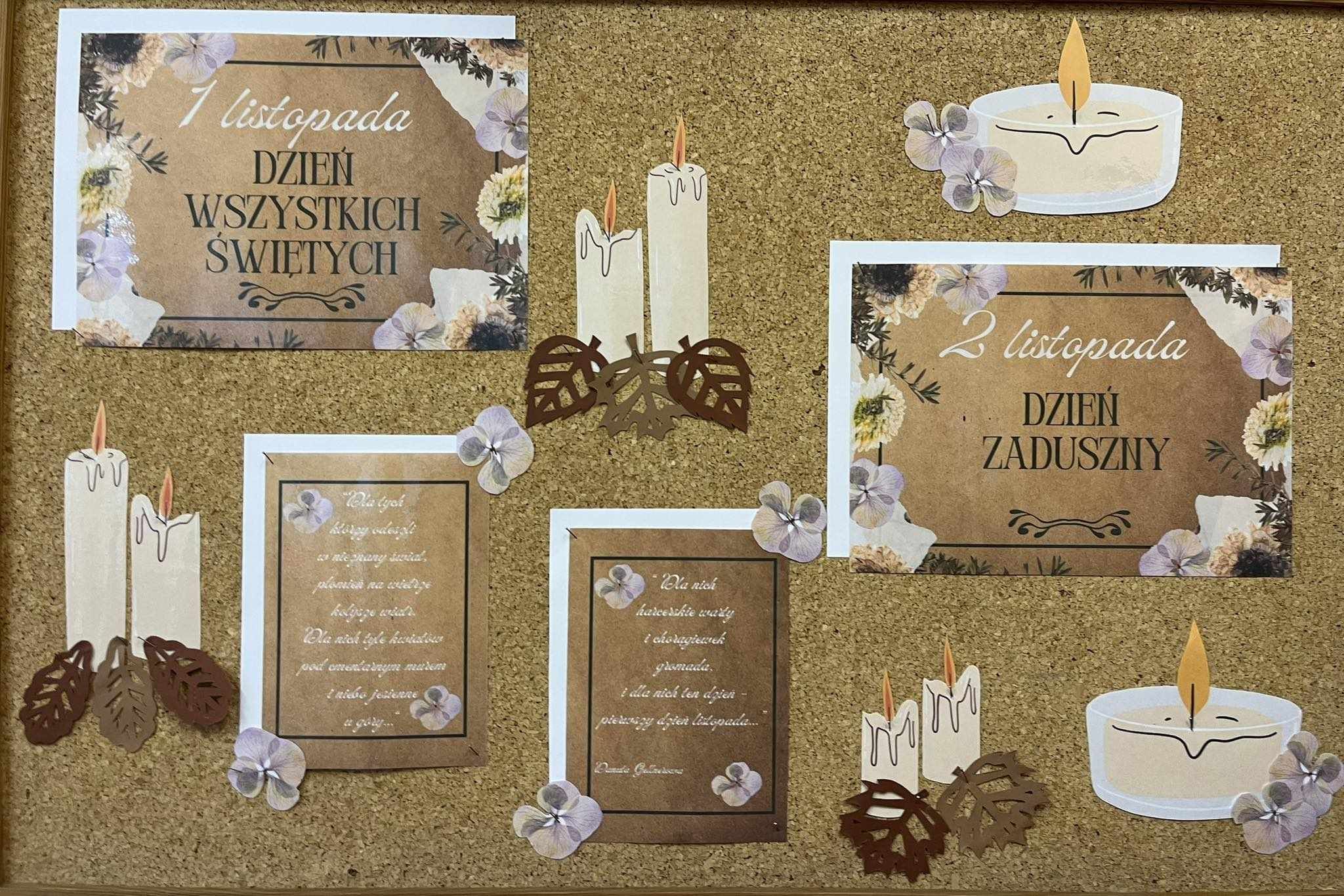 #SzkołaPamięta. Uczniowie wysłuchali wierszy dotyczących Święta Zmarłych oraz wykonali prace plastyczne, które ozdobiły gazetkę ścienną