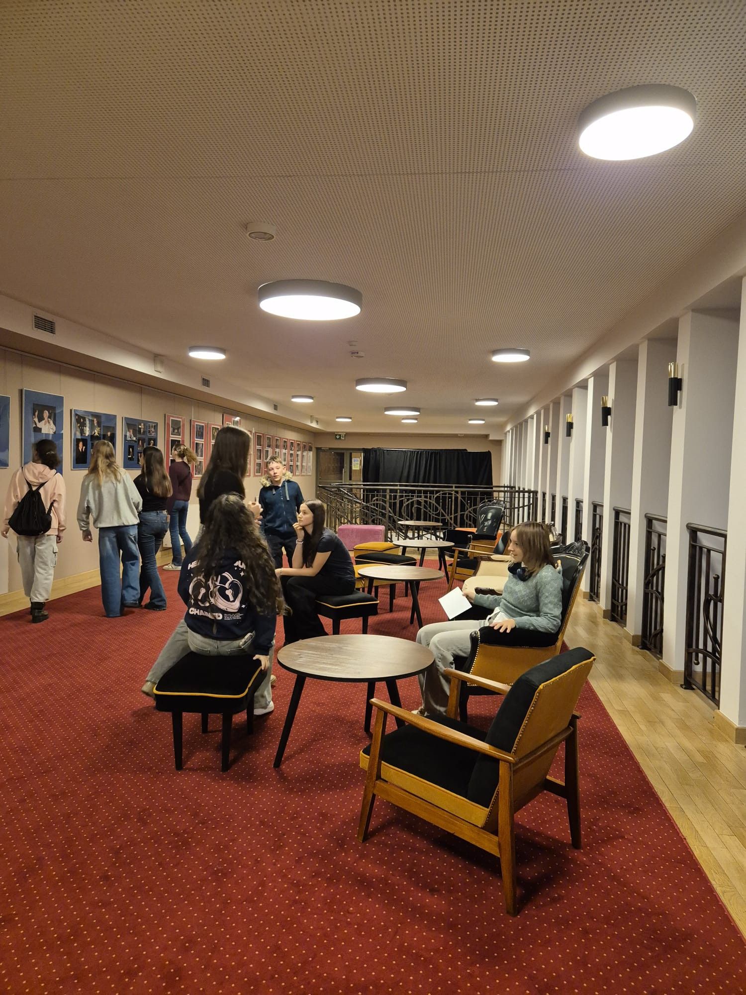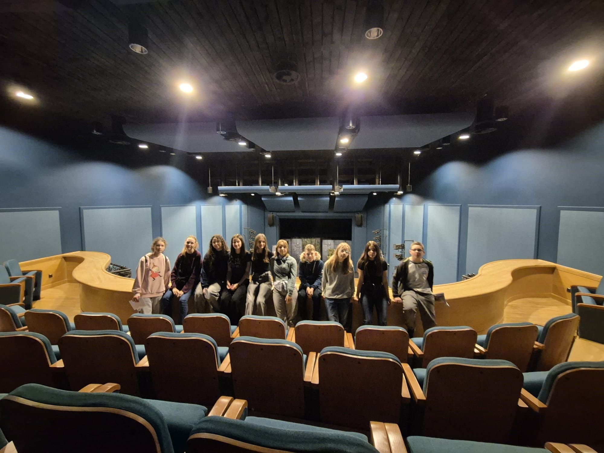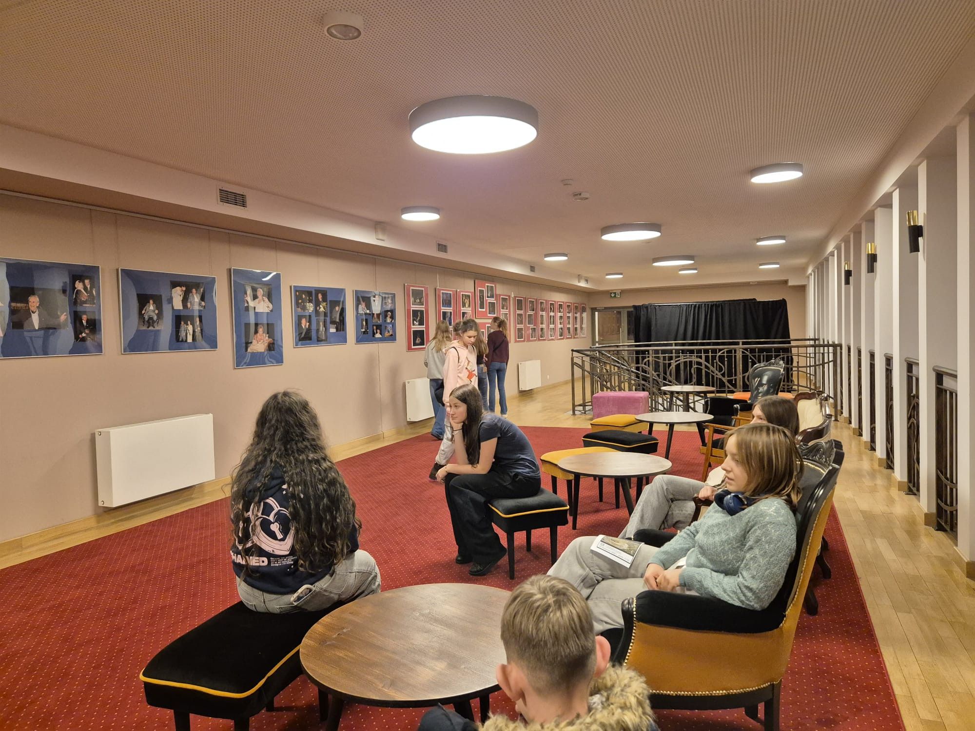 Następnie grupa rozpoczęła zwiedzanie budynku. Najpierw weszli do foyer, gdzie omówiono funkcje tej przestrzeni i jej rolę w kontakcie widza z teatrem. Kolejnym punktem była sala główna, w której uczniowie mogli poczuć atmosferę prawdziwych teatralnych wydarzeń – usiedli wśród rzędów foteli, przyglądając się scenie z perspektywy widza.