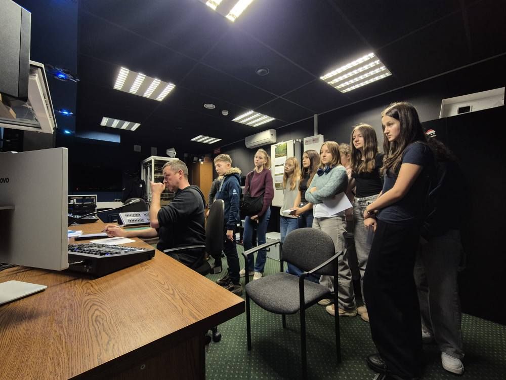Na końcu trasy Pani Aleksandra zaprowadziła grupę do pomieszczenia operatorów dźwięku i światła, gdzie wyjaśniła, jak powstają efekty świetlne i dźwiękowe oraz jak synchronizuje się je z akcją spektaklu. Młodzież mogła zobaczyć profesjonalną aparaturę i dowiedzieć się, jak wymagająca i odpowiedzialna jest praca realizatorów technicznych.