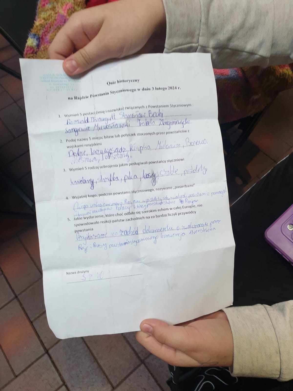 W czasie rajdu odbył się Quizz historyczny wiedzy o Powstaniu Styczniowym - nasi uczniowie otrzymali pamiątkowy dyplom oraz nagrodę!!!