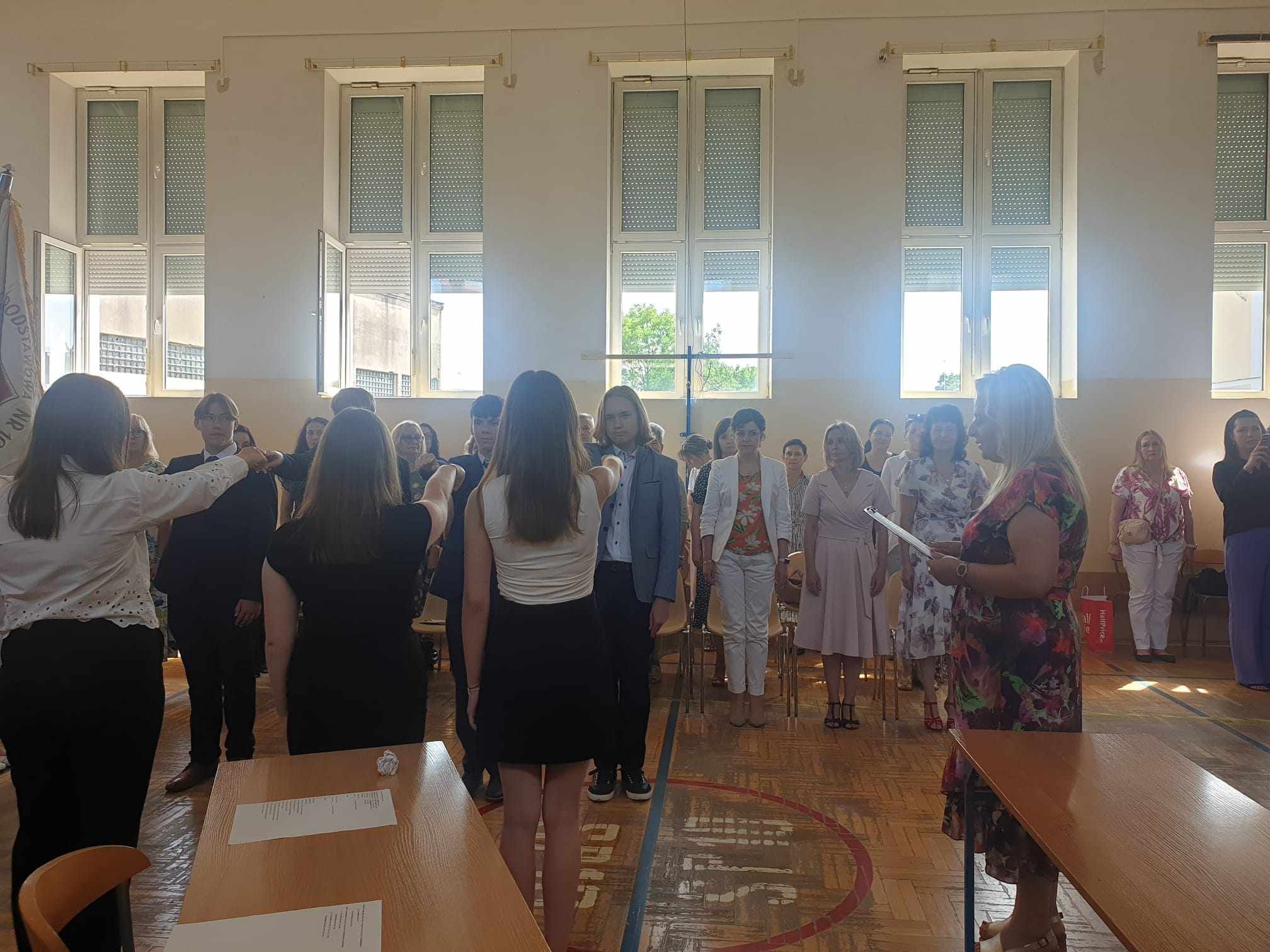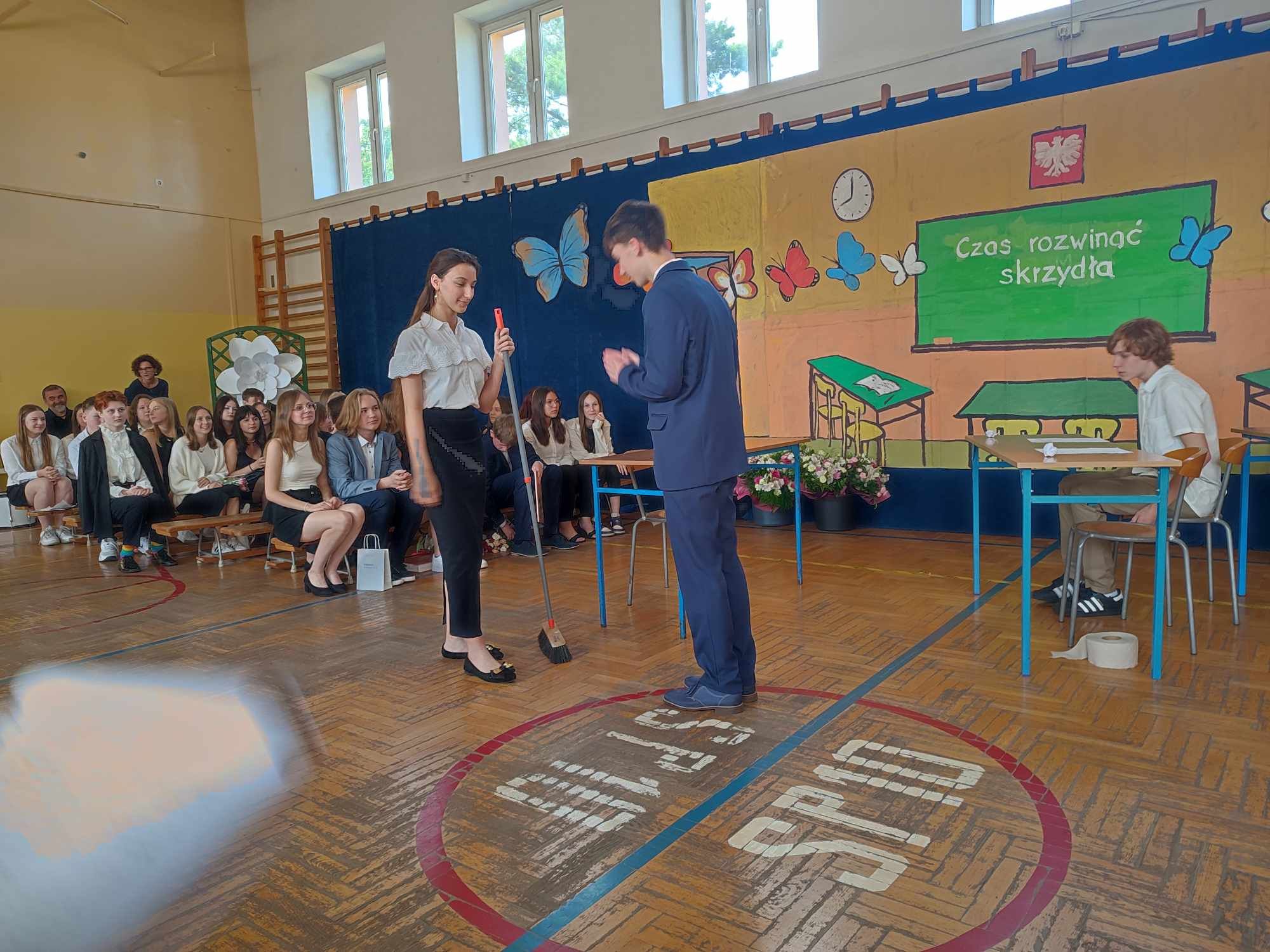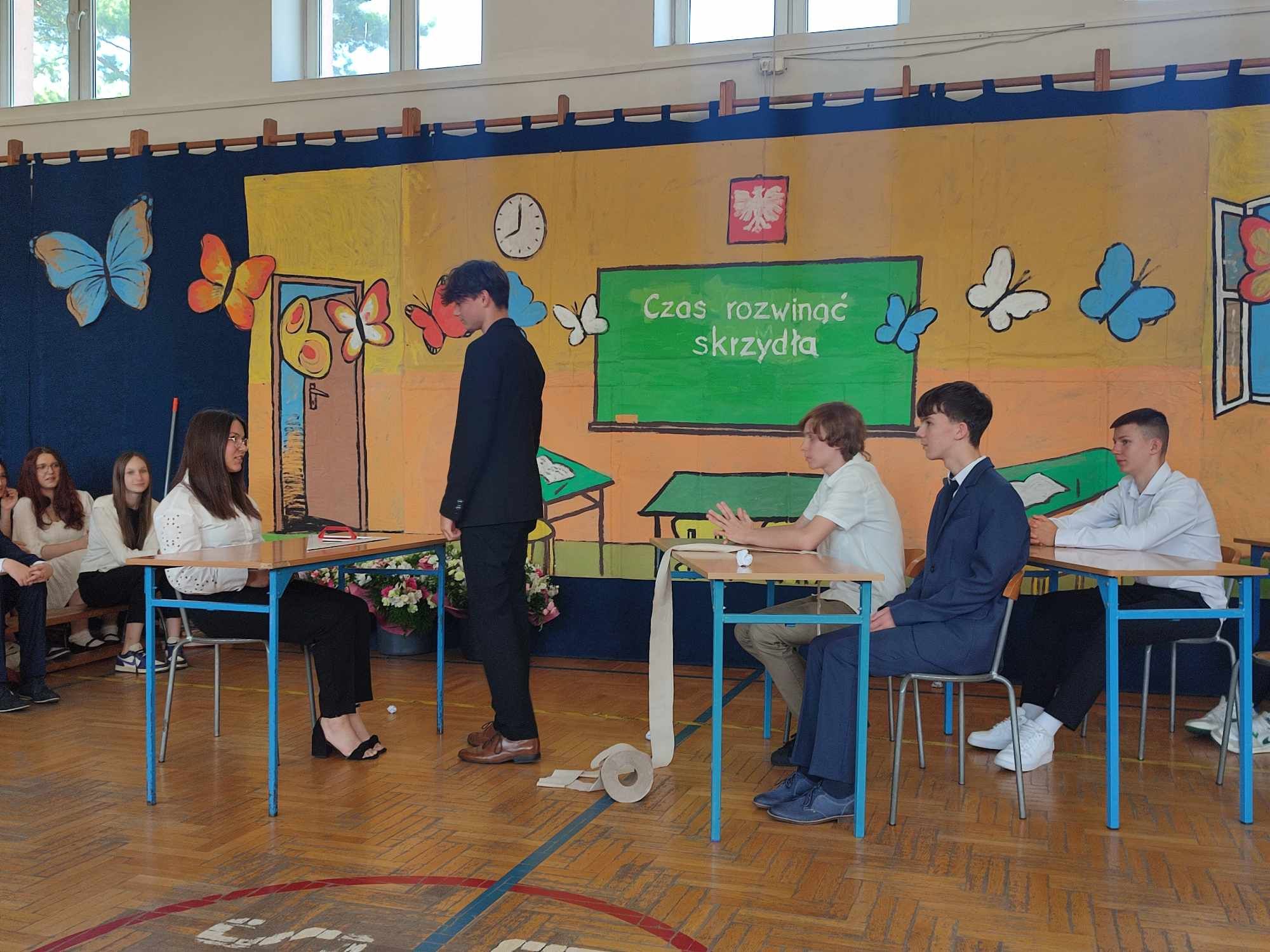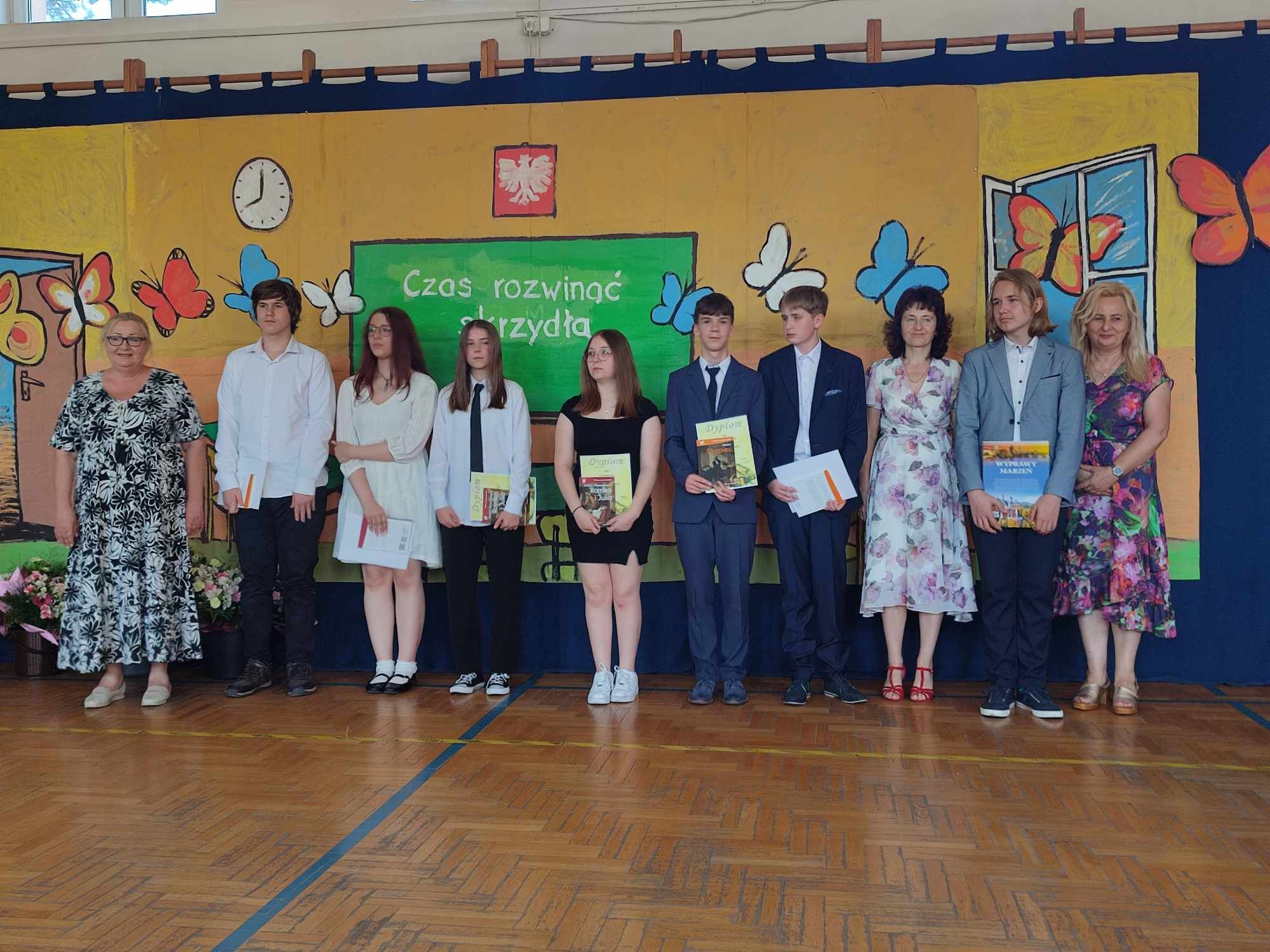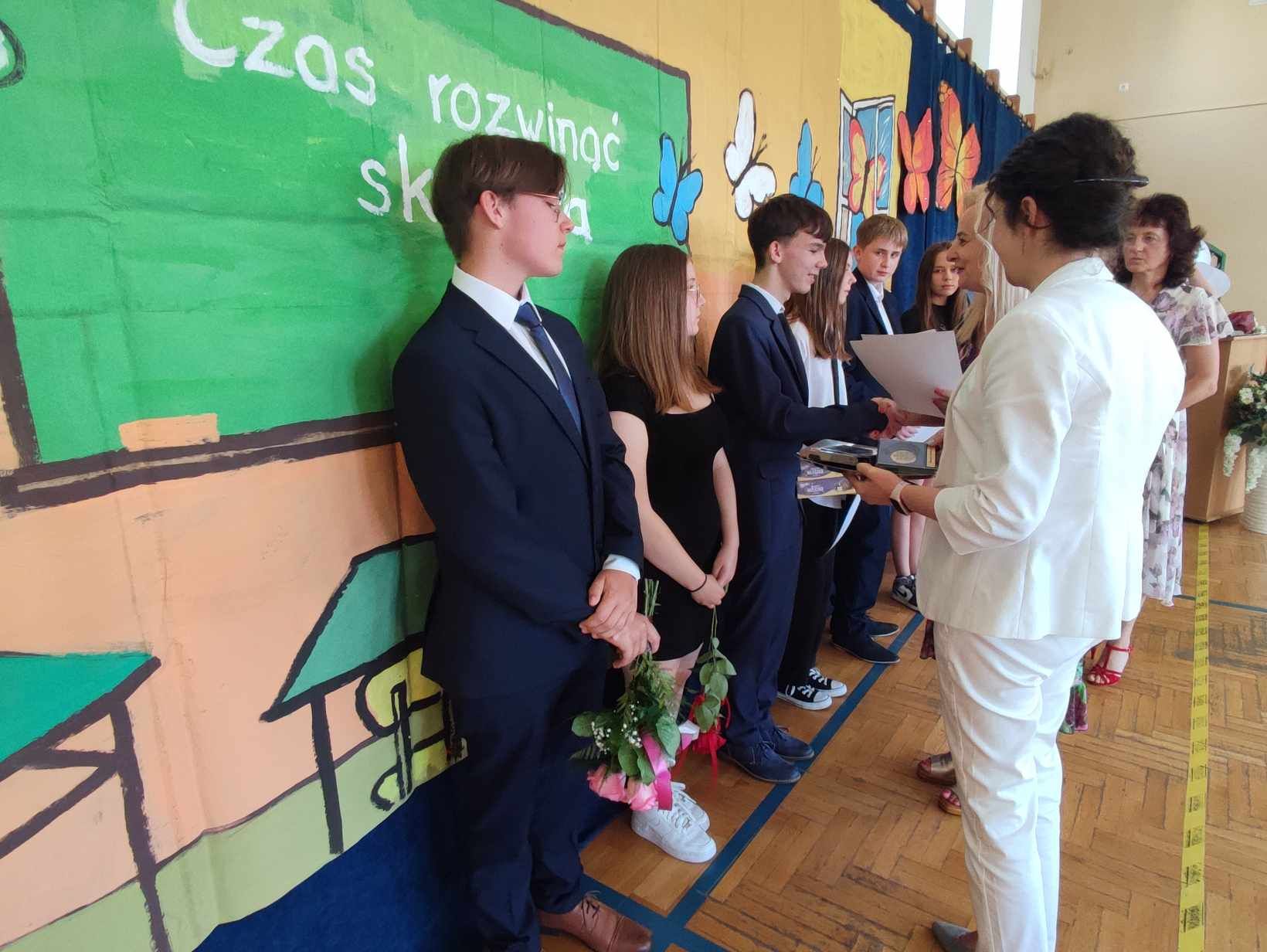 Dziś w naszej szkole odbyło się uroczyste zakończenie roku szkolnego klas VIII. Wydarzenie rozpoczęło się uroczystym ślubowaniem absolwentów, następnie uczniowie klas VIII zaprezentowali część artystyczną. Po krótkim występie nastąpiło wręczanie dyplomów oraz nagród. Najważniejszą nagrodą przyznawaną w naszej szkole są medale: