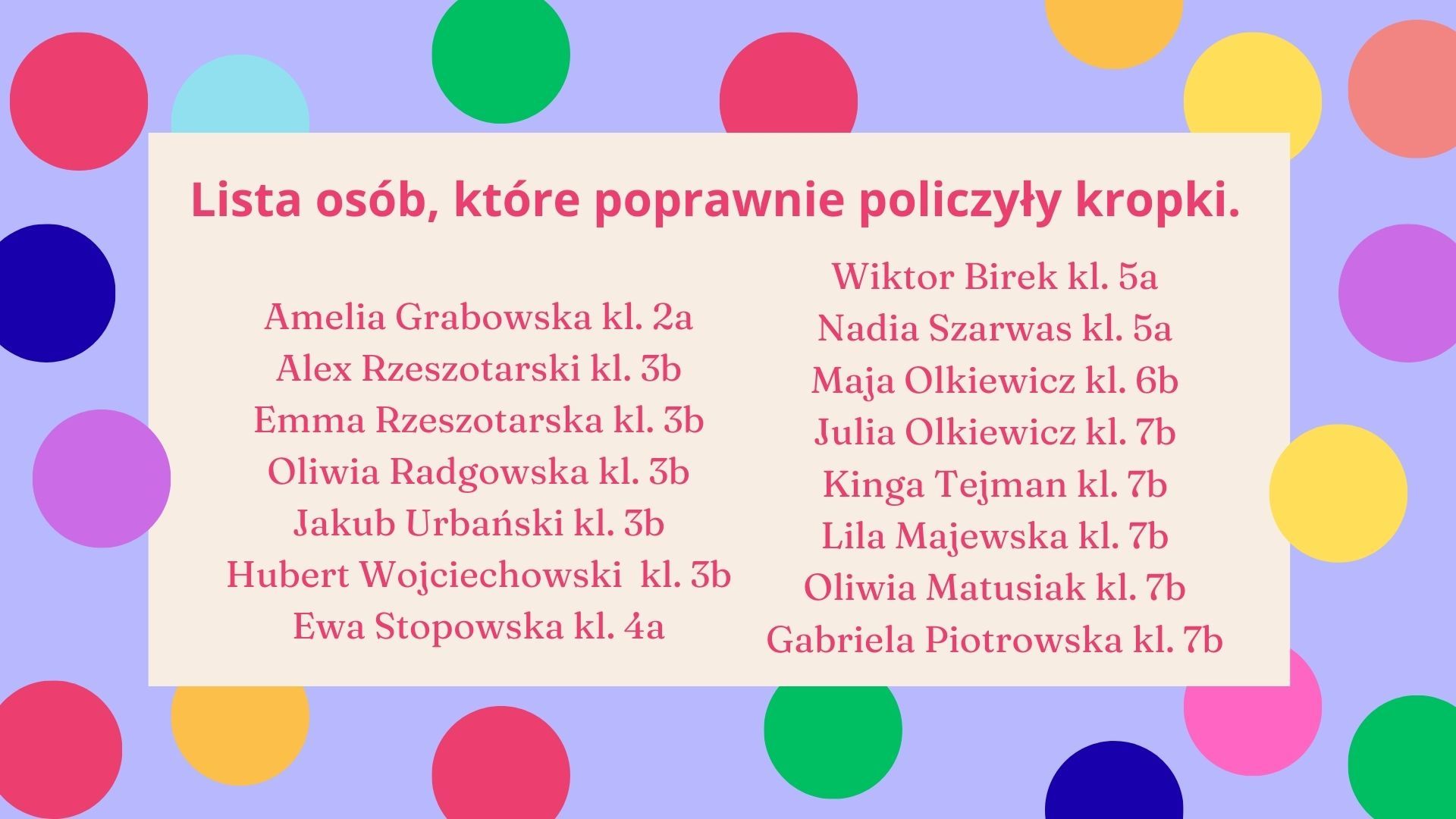 Z radością informujemy, że zakończył się konkurs „Liczenia kropek”, w którym uczniowie naszej szkoły mogli sprawdzić swoją spostrzegawczość, koncentrację oraz refleks.